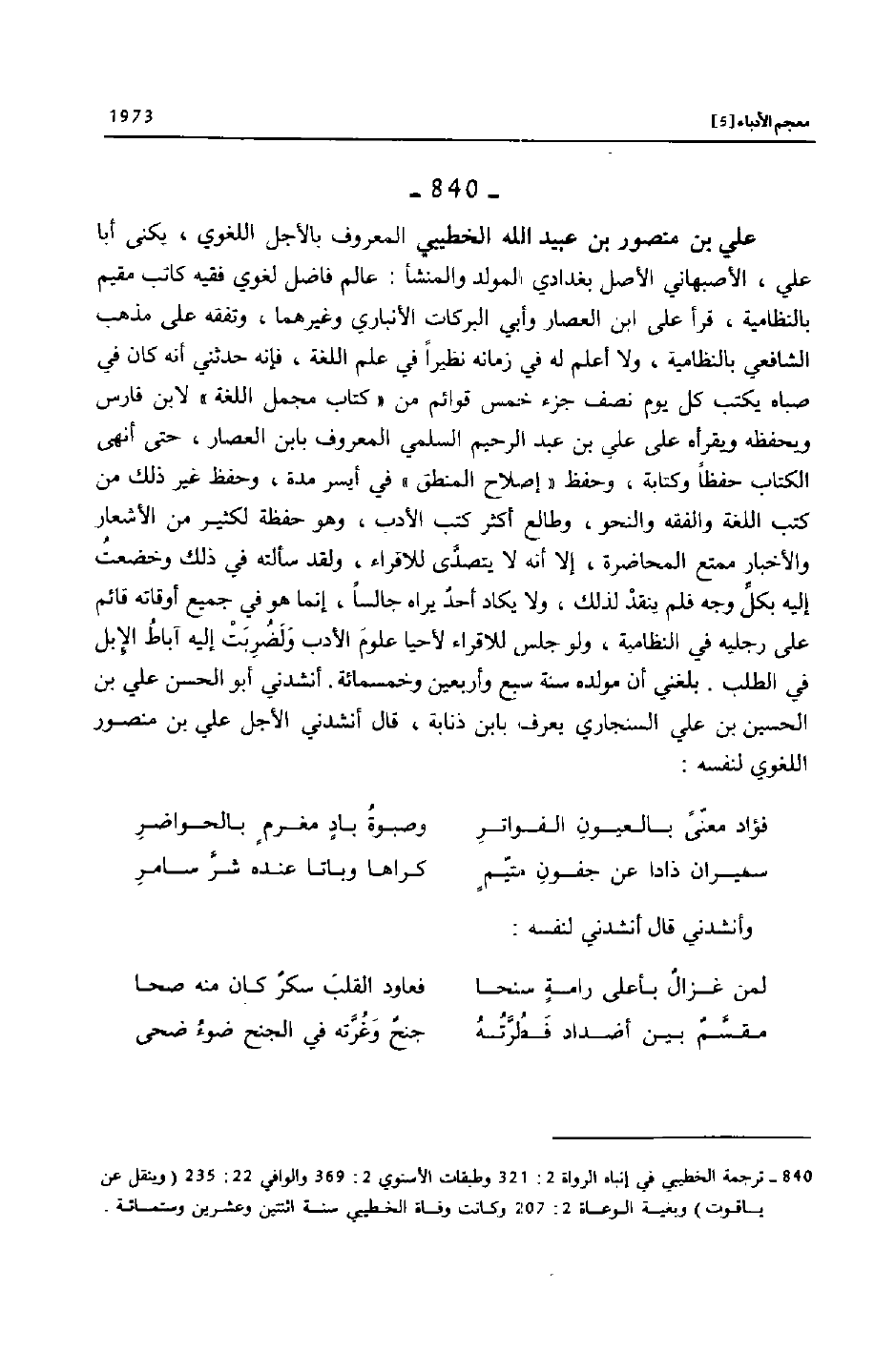 (840) - ترجمة الخطيبي في إنباه الرواة 2: 321 وطبقات الأسنوي 2: 369 والوافى 22: 235 (وينقل عن ياقوت) وبغية الوعاة 2: 207 وكانت وفاة الخطيبي سنة اثنتين وعشرين وستمائة.