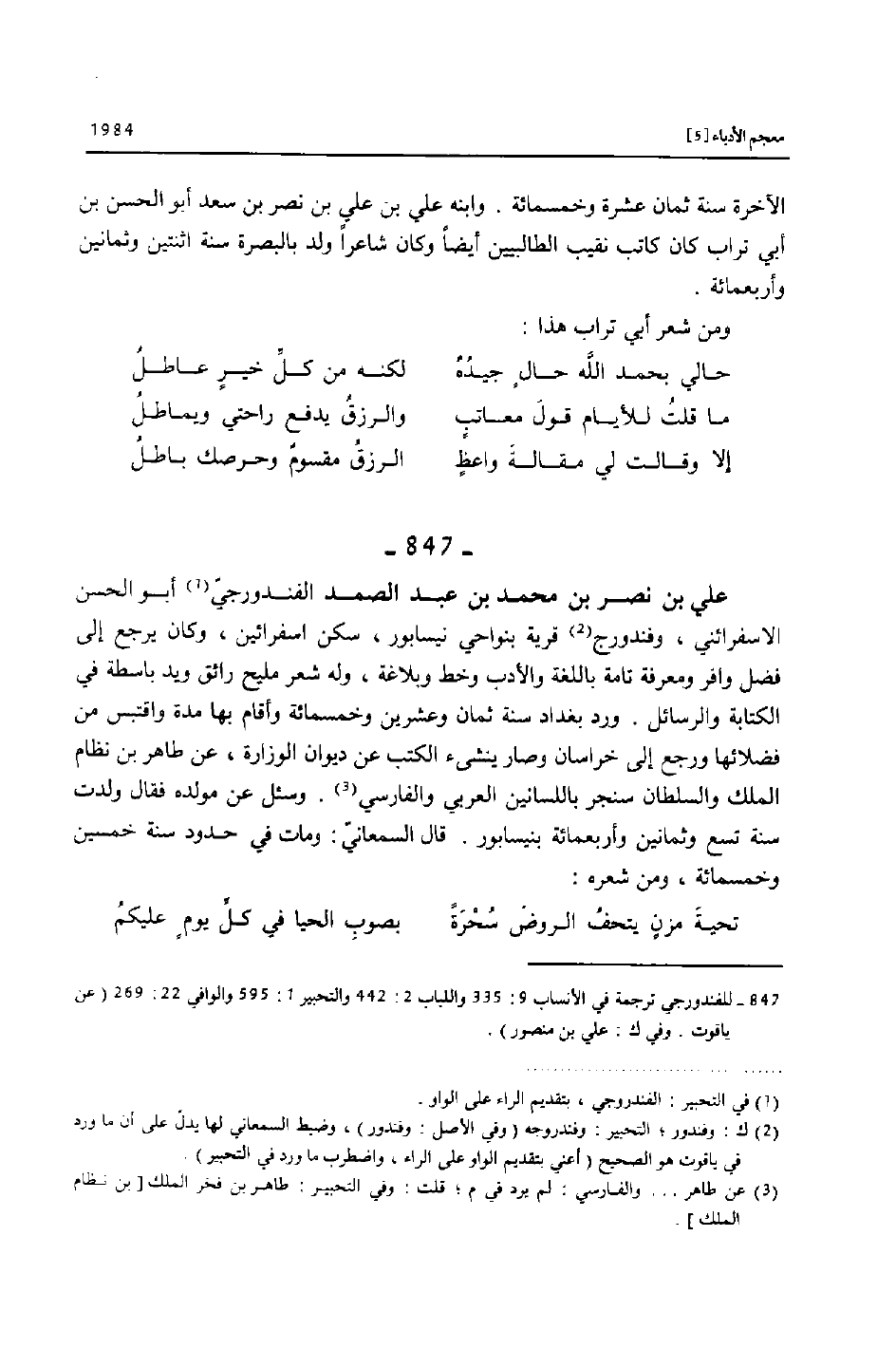 (847) - للفندورجي ترجمة في الأنساب 9: 335 واللباب 2: 442 والتحبير 1: 595 والوافي 22: 269 (عن ياقوت. وفي ك: علي بن منصور) .