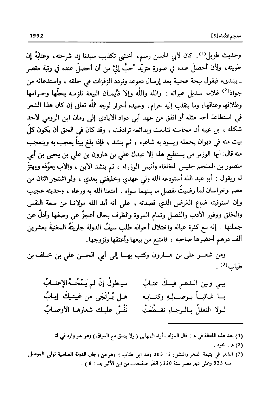 وحديث طويل «1» . كان لأبي الحسن رسم، أخشى تكذيب سيدنا إن شرحته، وعتابه إن طويته، ولأن أحصل عنده في صورة متزيّد أحبّ إليّ من أن أحصل عنده في رتبة مقصر- يبتدىء فيقول ببحة عجيبة بعد إرسال دموعه وتردد الزفرات في حلقه، واستدعائه من جواذ «2» غلامه منديل عبراته: والله والله وإلا فأيمان البيعة تلزمه بحلّها وحرامها وطلاقها وعتاقها، وما ينقلب إليه حرام، وعبيده أحرار لوجه الله تعالى إن كان هذا الشعر في استطاعة أحد مثله أو اتفق من عهد أبي دواد الايادي إلى زمان ابن الرومي لأحد شكله، بل عيبه أن محاسنه تتابعت وبدائعه ترادفت، وقد كان في الحق أن يكون كلّ بيت منه في ديوان يحمله ويسود به شاعره، ثم ينشد، فإذا بلغ بيتا يعجب به ويتعجب منه قال: أيها الوزير من يستطيع هذا إلا عبدك علي بن هارون بن علي بن يحيى بن أبي منصور بن المنجم جليس الخلفاء وأنيس الوزراء، ثم ينشد الابن، والأدب يعوّذه ويهتزّ له ويقول: أبو عبد الله أستودعه الله ولي عهدي وخليفتي بعدي، ولو اشتجر اثنان من مصر وخراسان لما رضيت بفصل ما بينهما سواه، أمتعنا الله به ورعاه، وحديثه عجيب وإن استوفيته ضاع الغرض الذي قصدته، على أنه أيد الله مولانا من سعة النفس والخلق ووفور الأدب والفضل وتمام المروة والظرف بحال أعجز عن وصفها وأدلّ عن جملتها: إنه مع كثرة عياله واختلال أحواله طلب سيف الدولة جاريته المغنية بعشرين ألف درهم أحضرها صاحبه، فامتنع من بيعها وأعتقها وتزوجها.