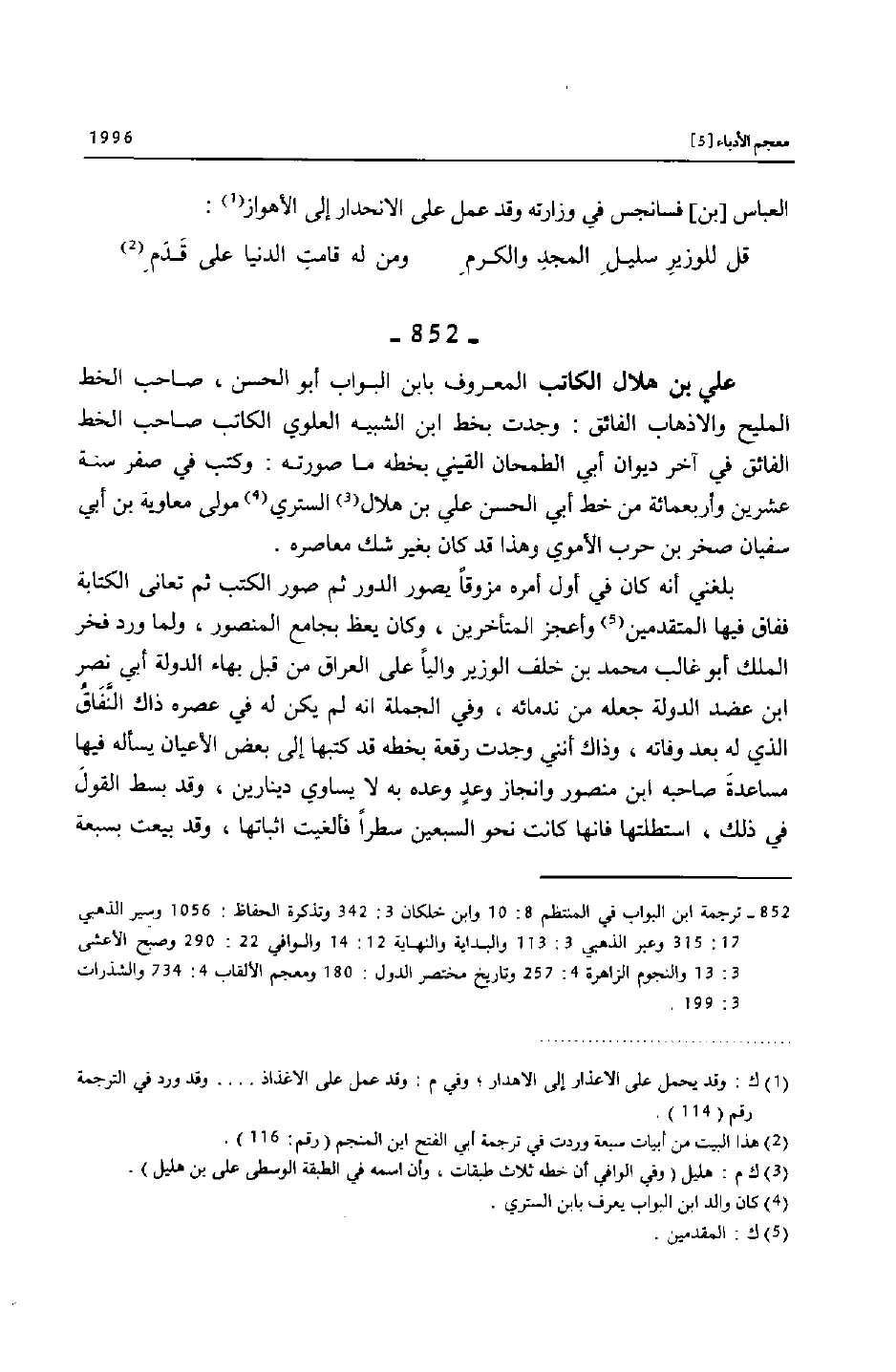 (852) - ترجمة ابن البواب في المنتظم 8: 10 وابن خلكان 3: 342 وتذكرة الحفاظ: 1056 وسير الذهبي 17: 315 وعبر الذهبي 3: 113 والبداية والنهاية 12: 14 والوافي 22: 290 وصبح الأعشى 3: 13 والنجوم الزاهرة 4: 257 وتاريخ مختصر الدول: 180 ومعجم الألقاب 4: 734 والشذرات 3: 199.