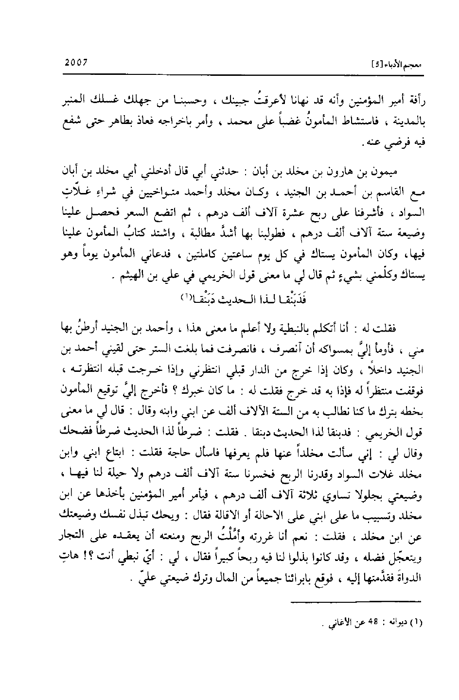 «1» فقلت له: أنا أتكلم بالنبطية ولا أعلم ما معنى هذا، وأحمد بن الجنيد أرطن بها مني، فأومأ إليّ بمسواكه أن انصرف، فانصرفت فما بلغت الستر حتى لقيني أحمد بن الجنيد داخلا، وكان إذا خرج من الدار قبلي انتظرني وإذا خرجت قبله انتظرته، فوقفت منتظرا له فإذا به قد خرج فقلت له: ما كان خبرك؟ فأخرج إليّ توقيع المأمون بخطه بترك ما كنا نطالب به من الستة الآلاف ألف عن ابني وابنه وقال: قال لي ما معنى قول الخريمي: فدبنقا لذا الحديث دبنقا. فقلت: ضرطا لذا الحديث ضرطا فضحك وقال لي: إني سألت مخلدا عنها فلم يعرفها فاسأل حاجة فقلت: ابتاع ابني وابن مخلد غلات السواد وقدرنا الربح فخسرنا ستة آلاف ألف درهم ولا حيلة لنا فيها، وضيعتي بجلولا تساوي ثلاثة آلاف ألف درهم، فيأمر أمير المؤمنين بأخذها عن ابن مخلد وتسبيب ما على ابني على الاحالة أو الاقالة فقال: ويحك تبذل نفسك وضيعتك عن ابن مخلد، فقلت: نعم أنا غررته وأمّلت الربح ومنعته أن يعقده على التجار ويتعجّل فضله، وقد كانوا بذلوا لنا فيه ربحا كبيرا فقال، لي: أيّ نبطي أنت؟! هات الدواة فقدّمتها إليه، فوقع بابرائنا جميعا من المال وترك ضيعتي عليّ.