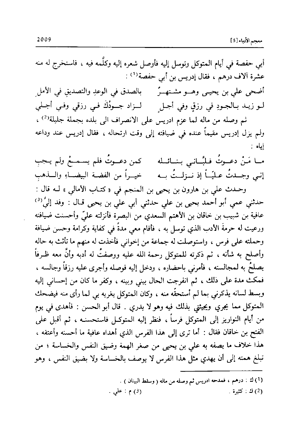 أبي حفصة في أيام المتوكل وتوسل إليه فأوصل شعره إليه وكلّمه فيه، فاستخرج له منه عشرة آلاف درهم، فقال إدريس بن أبي حفصة «1» :