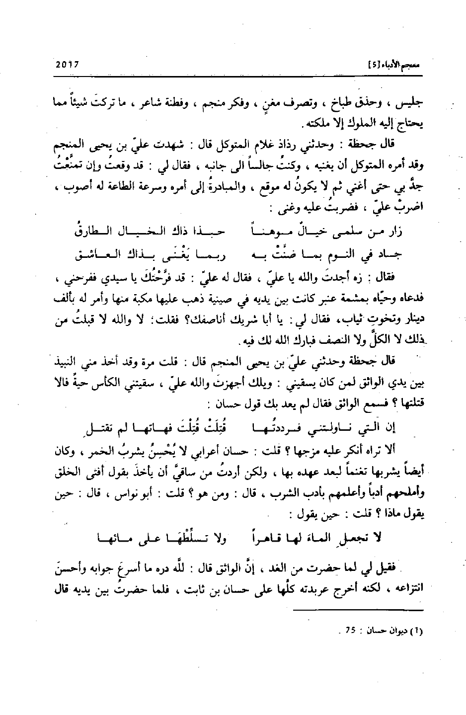 «1» فقيل لي لما حضرت من الغد، إنّ الواثق قال: لله دره ما أسرع جوابه وأحسن انتزاعه، لكنه أخرج عربدته كلّها على حسان بن ثابت، فلما حضرت بين يديه قال