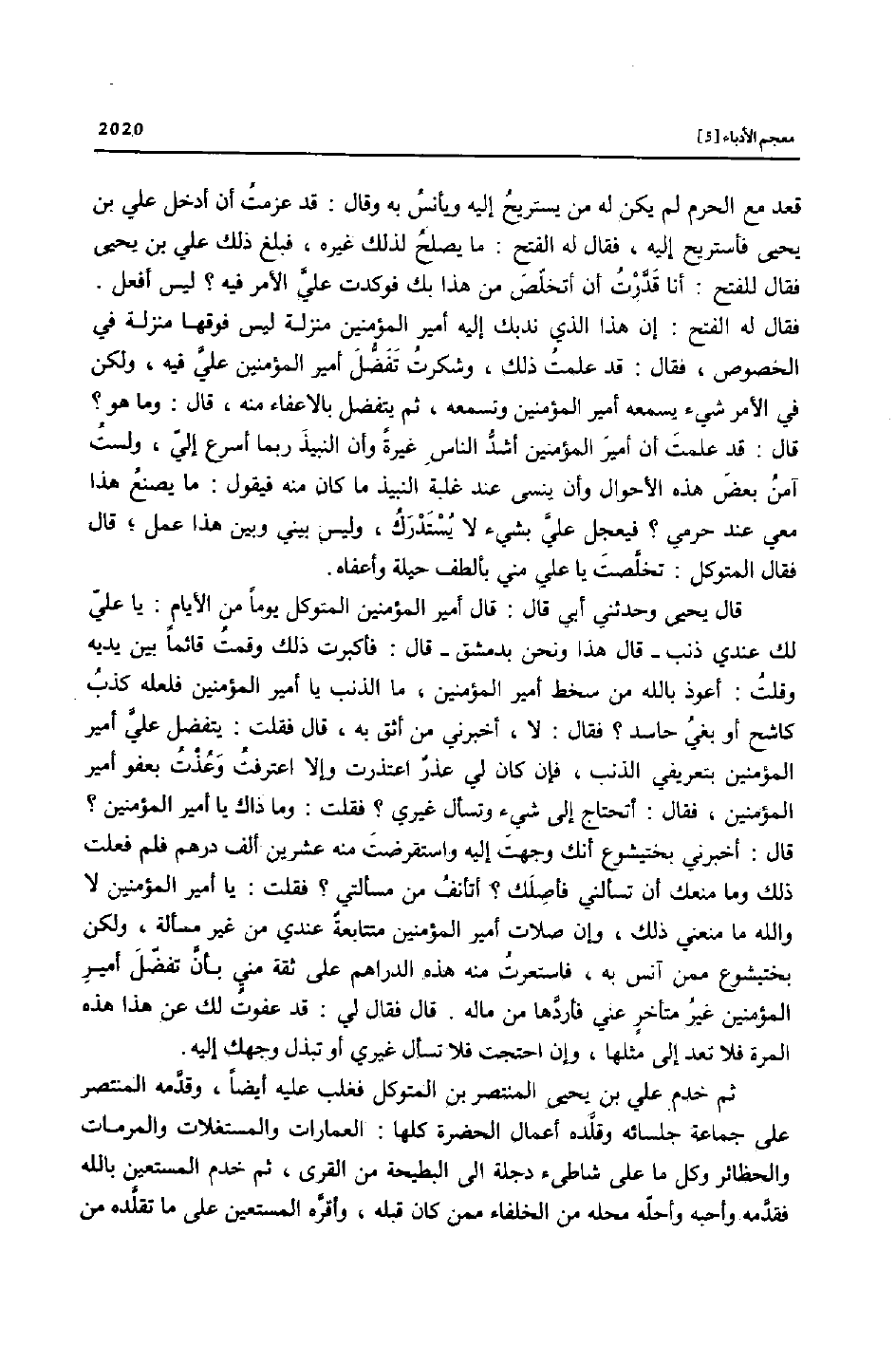 قال يحيى وحدثني أبي قال: قال أمير المؤمنين المتوكل يوما من الأيام: يا عليّ لك عندي ذنب- قال هذا ونحن بدمشق- قال: فأكبرت ذلك وقمت قائما بين يديه وقلت: أعوذ بالله من سخط أمير المؤمنين، ما الذنب يا أمير المؤمنين فلعله كذب كاشح أو بغي حاسد؟ فقال: لا، أخبرني من أثق به، قال فقلت: يتفضل عليّ أمير المؤمنين بتعريفي الذنب، فإن كان لي عذر اعتذرت وإلا اعترفت وعذت بعفو أمير المؤمنين، فقال: أتحتاج إلى شيء وتسأل غيري؟ فقلت: وما ذاك يا أمير المؤمنين؟