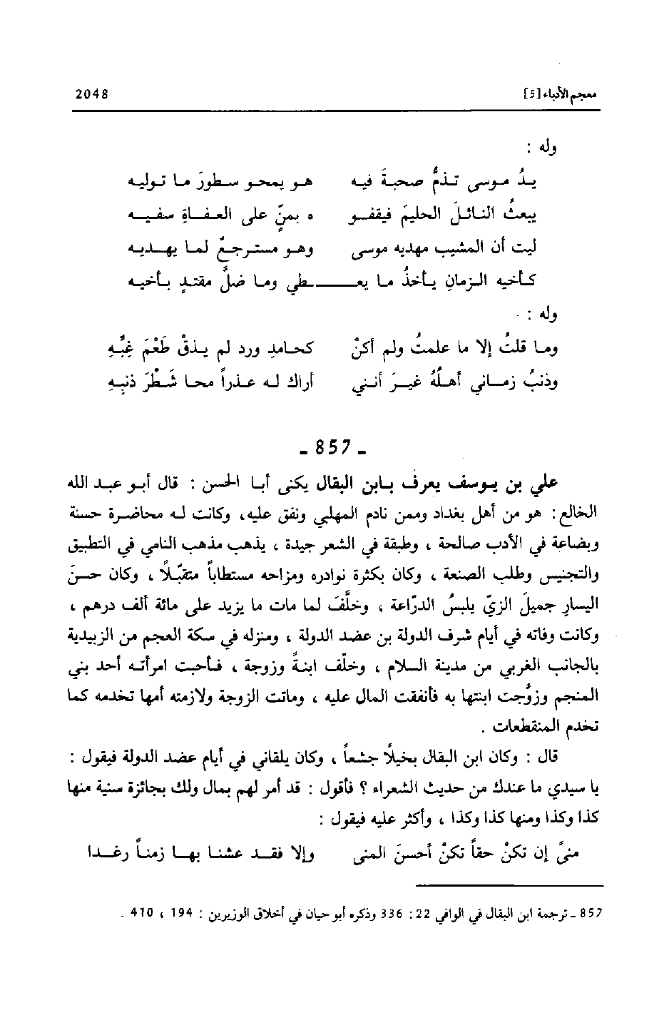 (857) - ترجمة ابن البقال في الوافي 22: 336 وذكره أبو حيان في أخلاق الوزيرين: 194، 410.