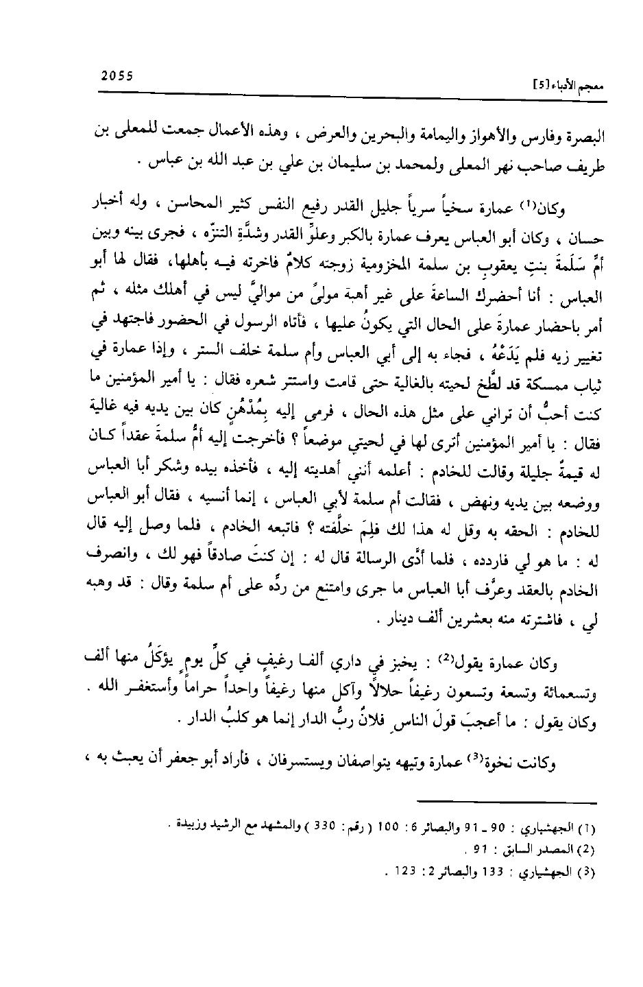 وكان «1» عمارة سخيا سريا جليل القدر رفيع النفس كثير المحاسن، وله أخبار حسان، وكان أبو العباس يعرف عمارة بالكبر وعلوّ القدر وشدّة التنزّه، فجرى بينه وبين أمّ سلمة بنت يعقوب بن سلمة المخزومية زوجته كلام فاخرته فيه بأهلها، فقال لها أبو العباس: أنا أحضرك الساعة على غير أهبة مولى من مواليّ ليس في أهلك مثله، ثم أمر باحضار عمارة على الحال التي يكون عليها، فأتاه الرسول في الحضور فاجتهد في تغيير زيه فلم يدعه، فجاء به إلى أبي العباس وأم سلمة خلف الستر، وإذا عمارة في ثياب ممسكة قد لطّخ لحيته بالغالية حتى قامت واستتر شعره فقال: يا أمير المؤمنين ما كنت أحبّ أن تراني على مثل هذه الحال، فرمى إليه بمدهن كان بين يديه فيه غالية فقال: يا أمير المؤمنين أترى لها في لحيتي موضعا؟ فأخرجت إليه أمّ سلمة عقدا كان له قيمة جليلة وقالت للخادم: أعلمه أنني أهديته إليه، فأخذه بيده وشكر أبا العباس ووضعه بين يديه ونهض، فقالت أم سلمة لأبي العباس، إنما أنسيه، فقال أبو العباس للخادم: الحقه به وقل له هذا لك فلم خلّفته؟ فاتبعه الخادم، فلما وصل إليه قال له: ما هو لي فاردده، فلما أدّى الرسالة قال له: إن كنت صادقا فهو لك، وانصرف الخادم بالعقد وعرّف أبا العباس ما جرى وامتنع من ردّه على أم سلمة وقال: قد وهبه لي، فاشترته منه بعشرين ألف دينار.