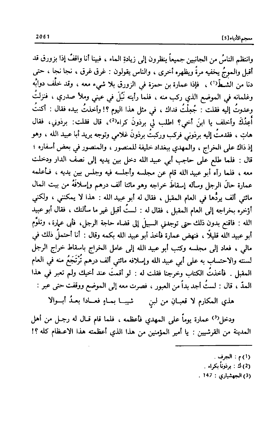 وانتظم الناس من الجانبين جميعا ينظرون إلى زيادة الماء، فبينا أنا واقف إذا بزورق قد أقبل والموج يخفيه مرة ويظهره أخرى، والناس يقولون: غرق غرق، نجا نجا، حتى دنا من الشطّ «1» ، فإذا عمارة بن حمزة في الزورق بلا شيء معه، وقد خلّف دوابّه وغلمانه في الموضع الذي ركب منه، فلما رأيته نبل في عيني وملأ صدري، فنزلت وعدوت إليه فقلت: جعلت فداك، في مثل هذا اليوم؟! وأخذت بيده فقال: أكنت أعدك وأخلف يا ابن أخي؟ اطلب لي برذون كراء «2» ، قال فقلت: برذوني، فقال هات، فقدمت إليه برذوني فركب وركبت برذون غلامي وتوجه يريد أبا عبيد الله، وهو إذ ذاك على الخراج، والمهدي ببغداد خليفة للمنصور، والمنصور في بعض أسفاره؛ قال: فلما طلع على حاجب أبي عبيد الله دخل بين يديه إلى نصف الدار ودخلت معه، فلما رآه أبو عبيد الله قام عن مجلسه وأجلسه فيه وجلس بين يديه، فأعلمه عمارة حال الرجل وسأله إسقاط خراجه وهو مائتا ألف درهم وإسلافه من بيت المال مائتي ألف يردّها في العام المقبل، فقال له أبو عبيد الله: هذا لا يمكنني، ولكني أؤخره بخراجه إلى العام المقبل، فقال له: لست أقبل غير ما سألتك، فقال أبو عبيد الله: فاقنع بدون ذلك حتى توجدني السبيل إلى قضاء حاجة الرجل، فأبى عمارة، وتلوّم أبو عبيد الله قليلا، فنهض عمارة فأخذ أبو عبيد الله بكمه وقال: أنا أحتمل ذلك في مالي، فعاد إلى مجلسه وكتب أبو عبيد الله إلى عامل الخراج باسقاط خراج الرجل لسنته والاحتساب به على أبي عبيد الله وإسلافه مائتي ألف درهم ترتجع منه في العام المقبل. فأخذت الكتاب وخرجنا فقلت له: لو أقمت عند أخيك ولم تعبر في هذا المدّ، قال: لست أجد بدا من العبور، فصرت معه إلى الموضع ووقفت حتى عبر: