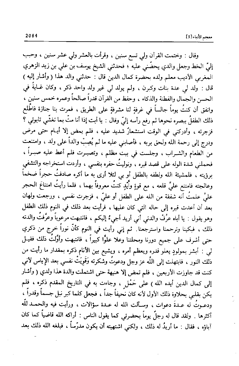 فزجرته، وأدركني في الوقت استشعار شديد عليه، فلم يمض إلا أيام حتى مرض ودرج إلى رحمة الله ولحق بربه، فأصابني عليه ما لم يصب والدا على ولد، وامتنعت من الطعام والشراب، وجلست في بيت مظلم، وتصبرت فلم أعط عليه صبرا، فحملني شدة الوله على قصد قبره، وتوليت حفره بنفسي، وأردت استخراجه والتشفي برؤيته، فلمشيئة الله ولطفه بالطفل أو بي لئلا أرى به ما أكره صادفت حجرا ضخما وعالجته فامتنع عليّ قلعه، مع قوة وأيد كنت معروفا بهما، فلما رأيت امتناع الحجر عليّ علمت أنه شفقة من الله على الطفل أو عليّ، فزجرت نفسي، ورجعت ولهان بعد أن أعدت قبره إلى حاله التي كان عليها، فرأيت بعد ذلك في النوم ذلك الطفل وهو يقول: يا أباه عرّف والدتي أني أريد أجيء إليكم، فانتبهت مرعوبا وعرّفت والدته ذلك، فبكينا وترحمنا واسترجعنا. ثم إني رأيت في النوم كأنّ نورا خرج من ذكري حتى أشرف على جميع دورنا ومحلتنا وعلا علوّا كبيرا، فانتبهت وأوّلت ذلك فقيل لي: أبشر بمولود يعلو قدره ويعظم أمره، ويشيع بين الأنام ذكره بمقدار ما رأيت من ذلك النور، فابتهلت إلى الله عز وجل ودعوت وشكرته وقويت نفسي بعد الإياس لأني كنت قد جاوزت الأربعين، فلم تمض إلا هنيهة حتى اشتملت والدة هذا ولدي (وأشار إلى كمال الدين أيده الله) على حمل، وجاءت به في التاريخ المقدم ذكره، فلم يكن بقلبي بحلاوة ذلك الأول لأنه كان نحيفا جدا، فجعل كلما كبر نبل جسما وقدرا، ودعوت له عدة دعوات، وسألت الله له عدة سؤالات، ورأيت فيه والحمد لله أكثرها. ولقد قال له رجل يوما بحضرتي كما يقول الناس: أراكه الله قاضيا كما كان آباؤه، فقال: ما أريد له ذلك، ولكني اشتهيته أن يكون مدرّسا، فبلغه الله ذلك بعد