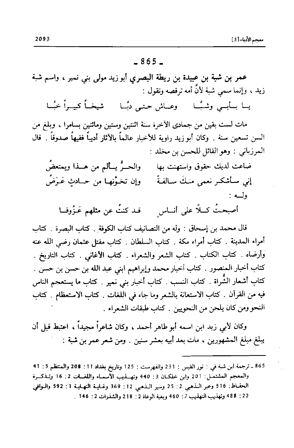 (865) - ترجمة ابن شبة في: نور القبس: 231 والفهرست: 125 وتاريخ بغداد 11: 208 والمنتظم 5: 41 والمعجم المشتمل: 201 وابن خلكان 3: 440 وتهذيب الأسماء واللغات 2: 16 وتذكرة الحفاظ: 516 وعبر الذهبي 2: 25 وسير الذهبي 12: 369 وغاية النهاية 1: 592 والوافي 22: 488 وتهذيب التهذيب 7: 460 وبغية الوعاة 2: 218 والشذرات 2: 146.