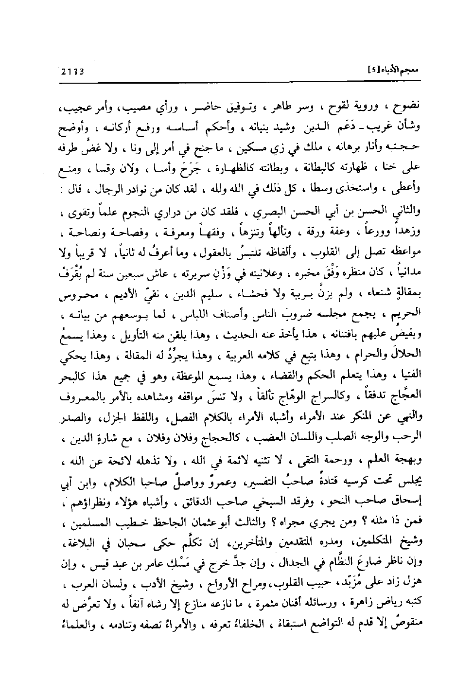 والثاني الحسن بن أبي الحسن البصري، فلقد كان من دراري النجوم علما وتقوى، وزهدا وورعا، وعفة ورقة، وتألها وتنزها، وفقها ومعرفة، وفصاحة ونصاحة، مواعظه تصل إلى القلوب، وألفاظه تلتبس بالعقول، وما أعرف له ثانيا، لا قريبا ولا مدانيا، كان منظره وفق مخبره، وعلانيته في وزن سريرته، عاش سبعين سنة لم يقرف بمقالة شنعاء، ولم يزنّ بريبة ولا فحشاء، سليم الدين، نقيّ الأديم، محروس الحريم، يجمع مجلسه ضروب الناس وأصناف اللباس، لما يوسعهم من بيانه، ويفيض عليهم بافتنانه، هذا يأخذ عنه الحديث، وهذا يلقن منه التأويل، وهذا يسمع الحلال والحرام، وهذا يتبع في كلامه العربية، وهذا يجرّد له المقالة، وهذا يحكي الفتيا، وهذا يتعلم الحكم والقضاء، وهذا يسمع الموعظة، وهو في جميع هذا كالبحر العجّاج تدفقا، وكالسراج الوهّاج تألقا، ولا تنس مواقفه ومشاهده بالأمر بالمعروف والنهي عن المنكر عند الأمراء وأشباه الأمراء بالكلام الفصل، واللفظ الجزل، والصدر الرحب والوجه الصلب واللسان العضب، كالحجاج وفلان وفلان، مع شارة الدين، وبهجة العلم، ورحمة التقى، لا تثنيه لائمة في الله، ولا تذهله لائحة عن الله، يجلس تحت كرسيه قتادة صاحب التفسير، وعمرو وواصل صاحبا الكلام، وابن أبي إسحاق صاحب النحو، وفرقد السبخي صاحب الدقائق، وأشباه هؤلاء ونظراؤهم، فمن ذا مثله؟ ومن يجري مجراه؟ والثالث أبو عثمان الجاحظ خطيب المسلمين، وشيخ المتكلمين، ومدره المتقدمين والمتأخرين، إن تكلّم حكى سحبان في البلاغة، وإن ناظر ضارع النظّام في الجدال، وإن جدّ خرج في مسك عامر بن عبد قيس، وإن هزل زاد على مزبّد، حبيب القلوب، ومراح الأرواح، وشيخ الأدب، ولسان العرب، كتبه رياض زاهرة، ورسائله أفنان مثمرة، ما نازعه منازع إلا رشاه آنفا، ولا تعرّض له منقوص إلا قدم له التواضع استبقاء، الخلفاء تعرفه، والأمراء تصفه وتنادمه، والعلماء