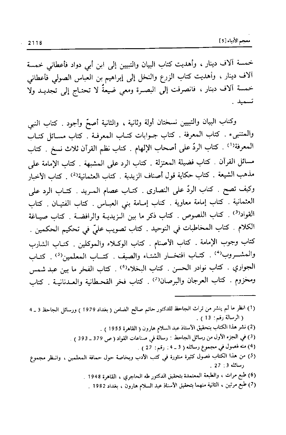 وكتاب البيان والتبيين نسختان أولة وثانية، والثانية أصحّ وأجود. كتاب النبي والمتنبىء. كتاب المعرفة. كتاب جوابات كتاب المعرفة. كتاب مسائل كتاب المعرفة «1» . كتاب الردّ على أصحاب الإلهام. كتاب نظم القرآن ثلاث نسخ. كتاب مسائل القرآن. كتاب فضيلة المعتزلة. كتاب الرد على المشبهة. كتاب الإمامة على مذهب الشيعة. كتاب حكاية قول أصناف الزيدية. كتاب العثمانية «2» . كتاب الأخبار وكيف تصح. كتاب الردّ على النصارى. كتاب عصام المريد. كتاب الرد على العثمانية. كتاب إمامة معاوية. كتاب إمامة بني العباس. كتاب الفتيان. كتاب القواد «3» . كتاب اللصوص. كتاب ذكر ما بين الزيدية والرافضة. كتاب صياغة الكلام. كتاب المخاطبات في التوحيد. كتاب تصويب عليّ في تحكيم الحكمين.