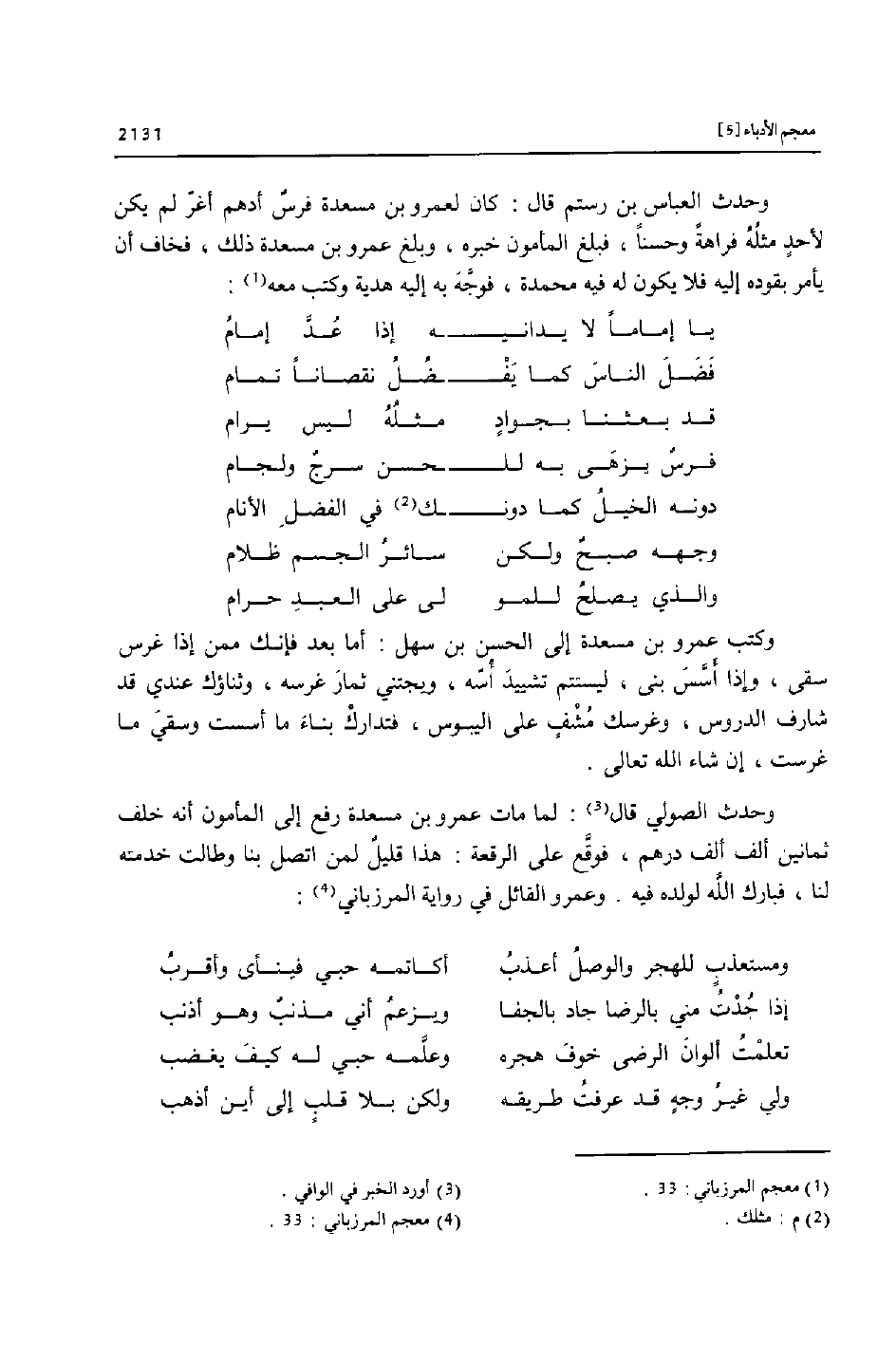 وحدث الصولي قال «3» : لما مات عمرو بن مسعدة رفع إلى المأمون أنه خلف ثمانين ألف ألف درهم، فوقّع على الرقعة: هذا قليل لمن اتصل بنا وطالت خدمته لنا، فبارك الله لولده فيه. وعمرو القائل في رواية المرزباني «4» :