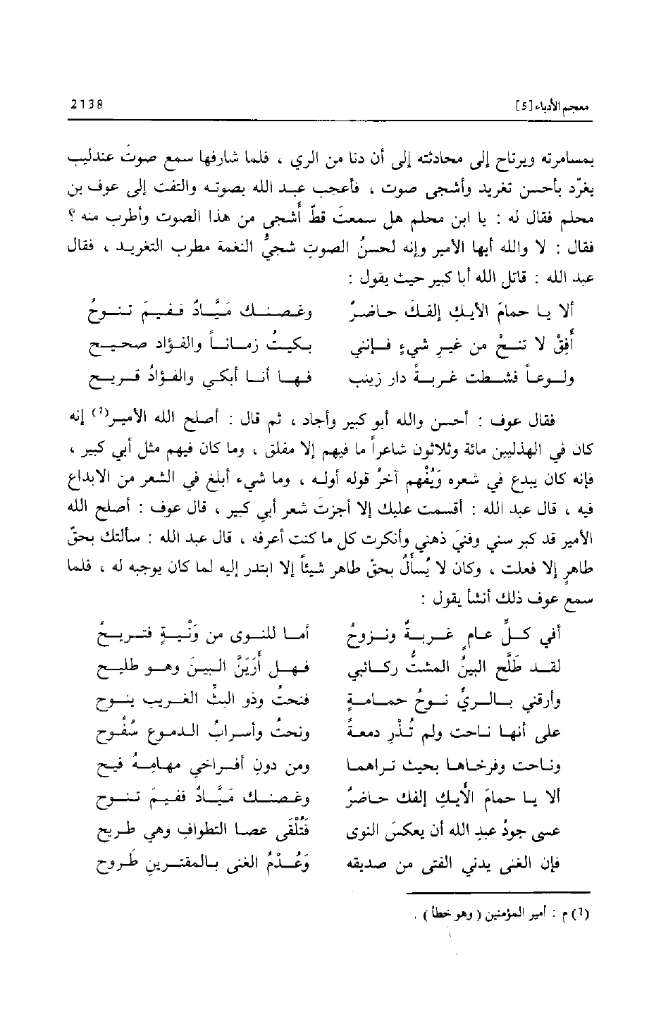 بمسامرته ويرتاح إلى محادثته إلى أن دنا من الري، فلما شارفها سمع صوت عندليب يغرّد بأحسن تغريد وأشجى صوت، فأعجب عبد الله بصوته والتفت إلى عوف بن محلم فقال له: يا ابن محلم هل سمعت قطّ أشجى من هذا الصوت وأطرب منه؟