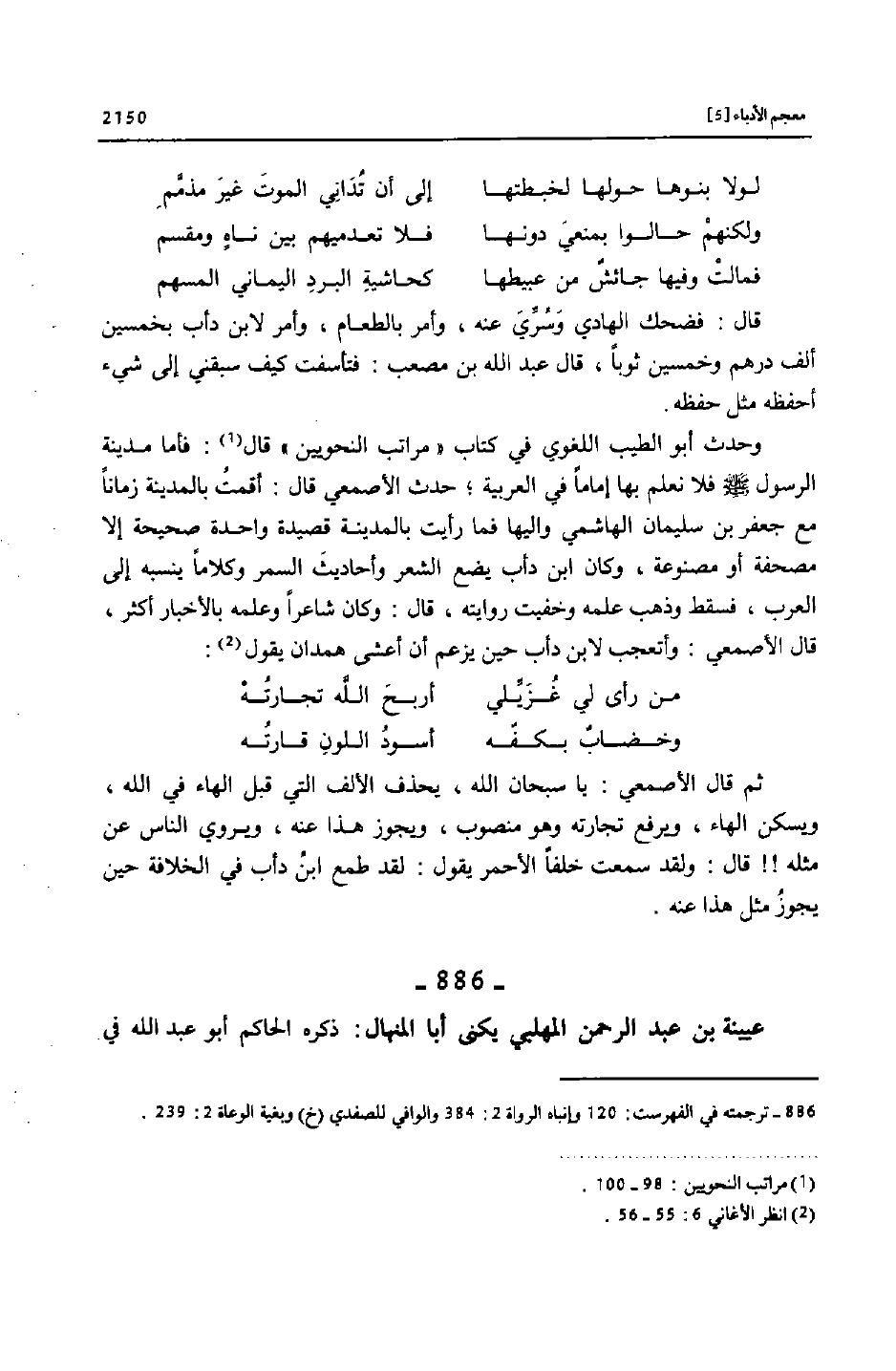 وحدث أبو الطيب اللغوي في كتاب «مراتب النحويين» قال «1» : فأما مدينة الرسول صلّى الله عليه وسلّم فلا نعلم بها إماما في العربية؛ حدث الأصمعي قال: أقمت بالمدينة زمانا مع جعفر بن سليمان الهاشمي واليها فما رأيت بالمدينة قصيدة واحدة صحيحة إلا مصحفة أو مصنوعة، وكان ابن دأب يضع الشعر وأحاديث السمر وكلاما ينسبه إلى العرب، فسقط وذهب علمه وخفيت روايته، قال: وكان شاعرا وعلمه بالأخبار أكثر، قال الأصمعي: وأتعجب لابن دأب حين يزعم أن أعشى همدان يقول «2» :