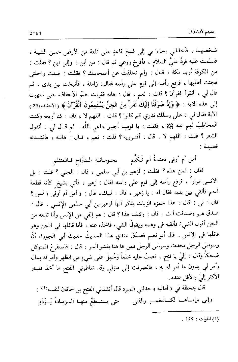 من الكوفة أريد مكة، قال: ولم تخلفت عن أصحابك؟ فقلت: ضلت راحلتي فجئت أطلبها، فرفع رأسه إلى قوم على رأسه فقال: زاملة، فأنيخت بين يدي، ثم قال لي، أتقرأ القرآن؟ قلت: نعم، قال: هاته فقرأت حم الأحقاف حتى انتهيت إلى هذه الآية: وَإِذْ صَرَفْنا إِلَيْكَ نَفَراً مِنَ الْجِنِّ يَسْتَمِعُونَ الْقُرْآنَ