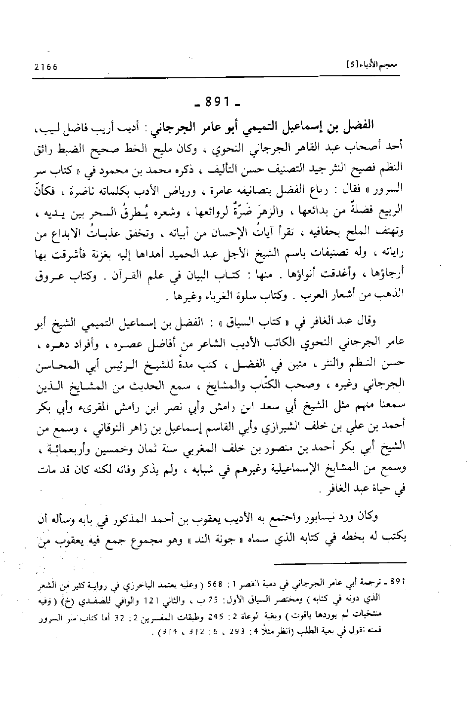 (891) - ترجمة أبي عامر الجرجاني في دمية القصر 1: 568 (وعليه يعتمد الباخرزي في رواية كثير من الشعر الذي دونه في كتابه) ومختصر السياق الأول: 75 ب، والثاني 121 والوافي للصفدي (خ) (وفيه منتخبات لم يوردها ياقوت) وبغية الوعاة 2: 245 وطبقات المفسرين 2: 32 أما كتاب سر السرور فمنه نقول في بغية الطلب (انظر مثلا 4: 293، 6: 312، 314) .