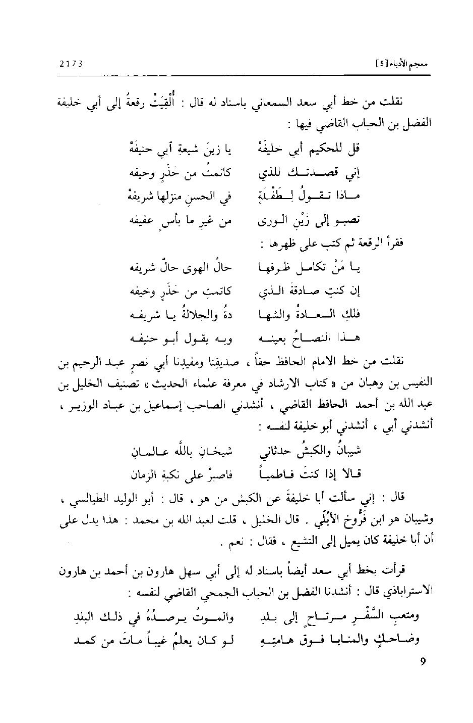 نقلت من خط الامام الحافظ حقا، صديقنا ومفيدنا أبي نصر عبد الرحيم بن النفيس بن وهبان من «كتاب الارشاد في معرفة علماء الحديث» تصنيف الخليل بن عبد الله بن أحمد الحافظ القاضي، أنشدني الصاحب إسماعيل بن عباد الوزير، أنشدني أبي، أنشدني أبو خليفة لنفسه: