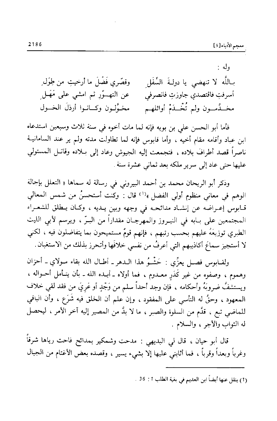 وذكر أبو الريحان محمد بن أحمد البيروني في رسالة له سماها «التعلل بإجالة الوهم في معاني منظوم أولي الفضل» «1» قال: وكنت أستحسن من شمس المعالي قابوس إعراضه عن إنشاد مدائحه في وجهه وبين يديه، وكان يطلق للشعراء المجتمعين على بابه في النيروز والمهرجان مقدارا من البرّ، ويرسم لأبي الليث الطبري توزيعه عليهم بحسب رتبهم، فإنهم قوم مستميحون بما يتفاضلون فيه، لكني لا أستجيز سماع أكاذيبهم التي أعرف من نفسي خلافها وأتحرز بذلك من الاستغبان.