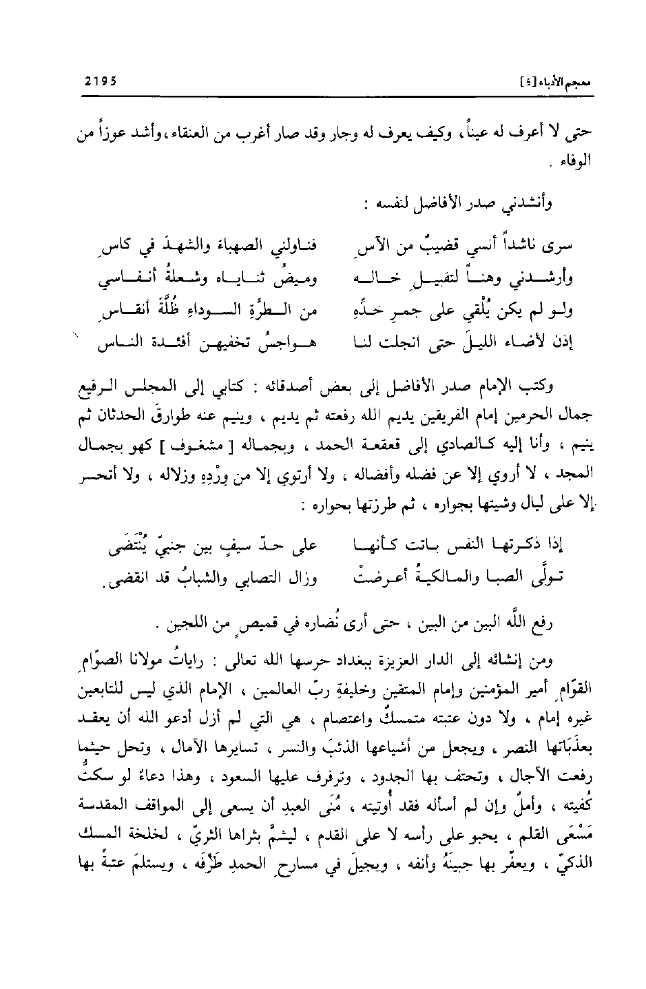 ومن إنشائه إلى الدار العزيزة ببغداد حرسها الله تعالى: رايات مولانا الصوّام القوّام أمير المؤمنين وإمام المتقين وخليفة ربّ العالمين، الإمام الذي ليس للتابعين غيره إمام، ولا دون عتبته متمسك واعتصام، هي التي لم أزل أدعو الله أن يعقد بعذباتها النصر، ويجعل من أشياعها الذئب والنسر، تسايرها الآمال، وتحل حيثما رفعت الآجال، وتحتف بها الجدود، وترفرف عليها السعود، وهذا دعاء لو سكتّ كفيته، وأمل وإن لم أسأله فقد أوتيته، منى العبد أن يسعى إلى المواقف المقدسة مسعى القلم، يحبو على رأسه لا على القدم، ليشمّ بثراها الثريّ، لخلخة المسك الذكيّ، ويعفّر بها جبينه وأنفه، ويجيل في مسارح الحمد طرفه، ويستلم عتبة بها