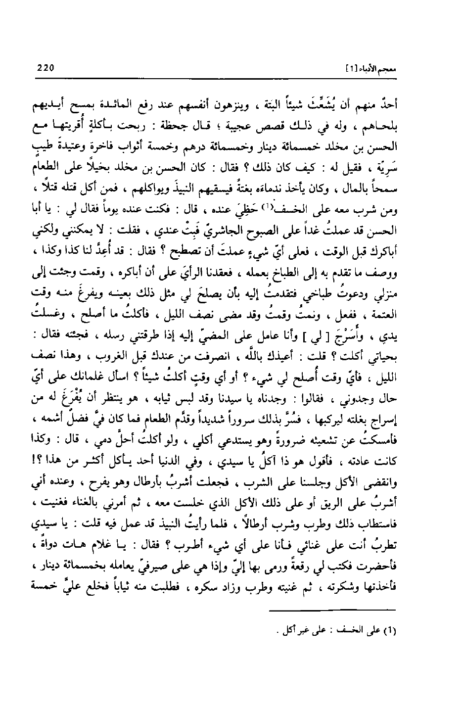 أحد منهم أن يشعّث شيئا البتة، وينزهون أنفسهم عند رفع المائدة بمسح أيديهم بلحاهم، وله في ذلك قصص عجيبة؛ قال جحظة: ربحت بأكلة أقريتها مع الحسن بن مخلد خمسمائة دينار وخمسمائة درهم وخمسة أثواب فاخرة وعتيدة طيب سريّة، فقيل له: كيف كان ذلك؟ فقال: كان الحسن بن مخلد بخيلا على الطعام سمحا بالمال، وكان يأخذ ندماءه بغتة فيسقيهم النبيذ ويواكلهم، فمن أكل قتله قتلا، ومن شرب معه على الخسف [1] حظي عنده، قال: فكنت عنده يوما فقال لي: يا أبا الحسن قد عملت غدا على الصبوح الجاشريّ فبت عندي، فقلت: لا يمكنني ولكني أباكرك قبل الوقت، فعلى أيّ شيء عملت أن تصطبح؟ فقال: قد أعدّ لنا كذا وكذا، ووصف ما تقدم به إلى الطباخ بعمله، فعقدنا الرأي على أن أباكره، وقمت وجئت إلى منزلي ودعوت طباخي فتقدمت إليه بأن يصلح لي مثل ذلك بعينه ويفرغ منه وقت العتمة، ففعل، ونمت وقمت وقد مضى نصف الليل، فأكلت ما أصلح، وغسلت يدي، وأسرج [لي] وأنا عامل على المضيّ إليه إذا طرقتني رسله، فجئته فقال: