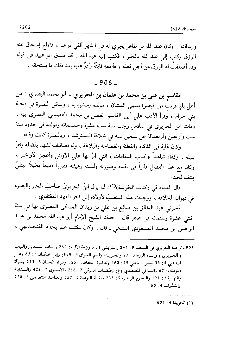 (906) - ترجمة الحريري في المنتظم 9: 241 والشريشي 1: 3 ونزهة الألباء: 262 وأنساب السمعاني واللباب (الحريري) وإنباه الرواة 3: 23 والخريدة (قسم العراق 4: 599) وابن خلكان 4: 63 وعبر الذهبي 4: 38 وسير الذهبي 19: 460 وتذكرة الحفاظ: 1257 ومرآة الجنان 3: 213 ومرآة الزمان: 67 والوافي للصفدي (خ) وطبقات السبكي 7: 266 والأسنوي 1: 429 والبداية والنهاية 2: 191 والنجوم الزاهرة 5: 235 وبغية الوعاة 2: 257 ومعاهد التنصيص 3: 270 والشذرات 4: 50.