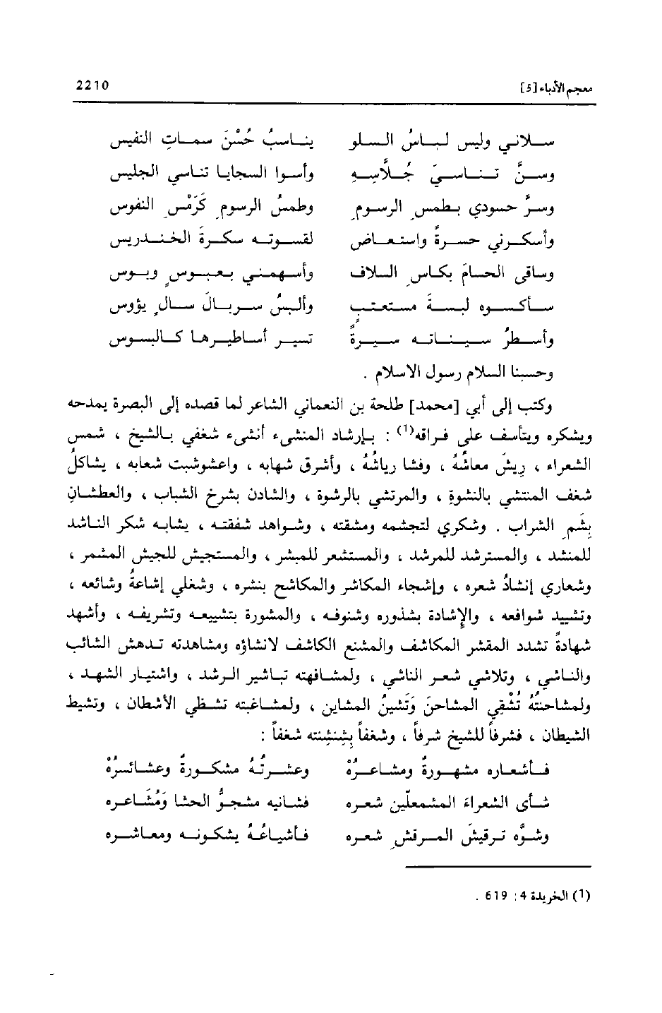 وكتب إلى أبي [محمد] طلحة بن النعماني الشاعر لما قصده إلى البصرة يمدحه ويشكره ويتأسف على فراقه «1» : بإرشاد المنشىء أنشىء شغفي بالشيخ، شمس الشعراء، ريش معاشه، وفشا رياشه، وأشرق شهابه، واعشوشبت شعابه، يشاكل شغف المنتشي بالنشوة، والمرتشي بالرشوة، والشادن بشرخ الشباب، والعطشان بشم الشراب. وشكري لتجشمه ومشقته، وشواهد شفقته، يشابه شكر الناشد للمنشد، والمسترشد للمرشد، والمستشعر للمبشر، والمستجيش للجيش المشمر، وشعاري إنشاد شعره، وإشجاء المكاشر والمكاشح بنشره، وشغلي إشاعة وشائعه، وتشييد شوافعه، والإشادة بشذوره وشنوفه، والمشورة بتشييعه وتشريفه، وأشهد شهادة تشدد المقشر المكاشف والمشنع الكاشف لا نشاؤه ومشاهدته تدهش الشائب والناشي، وتلاشي شعر الناشي، ولمشافهته تباشير الرشد، واشتيار الشهد، ولمشاحنته تشقي المشاحن وتشين المشاين، ولمشاغبته تشظي الأشطان، وتشيط الشيطان، فشرفا للشيخ شرفا، وشغفا بشنشنته شغفا: