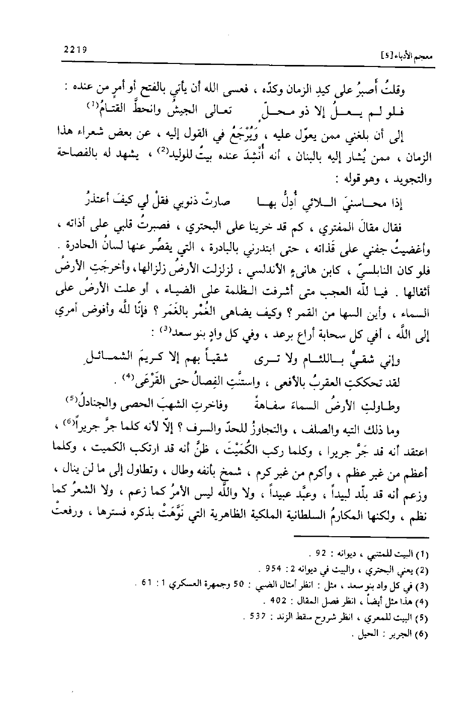 فقال مقال المفتري، كم قد خرينا على البحتري، فصبرت قلبي على أذاته، وأغضيت جفني على قذاته، حتى ابتدرني بالبادرة، التي يقصّر عنها لسان الحادرة.