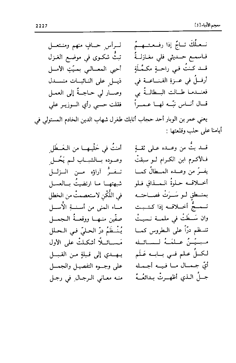 يعني عمر بن الوبار أحد حجاب أتابك طغرل شهاب الدين الخادم المستولي في أيامنا على حلب وقلعتها: