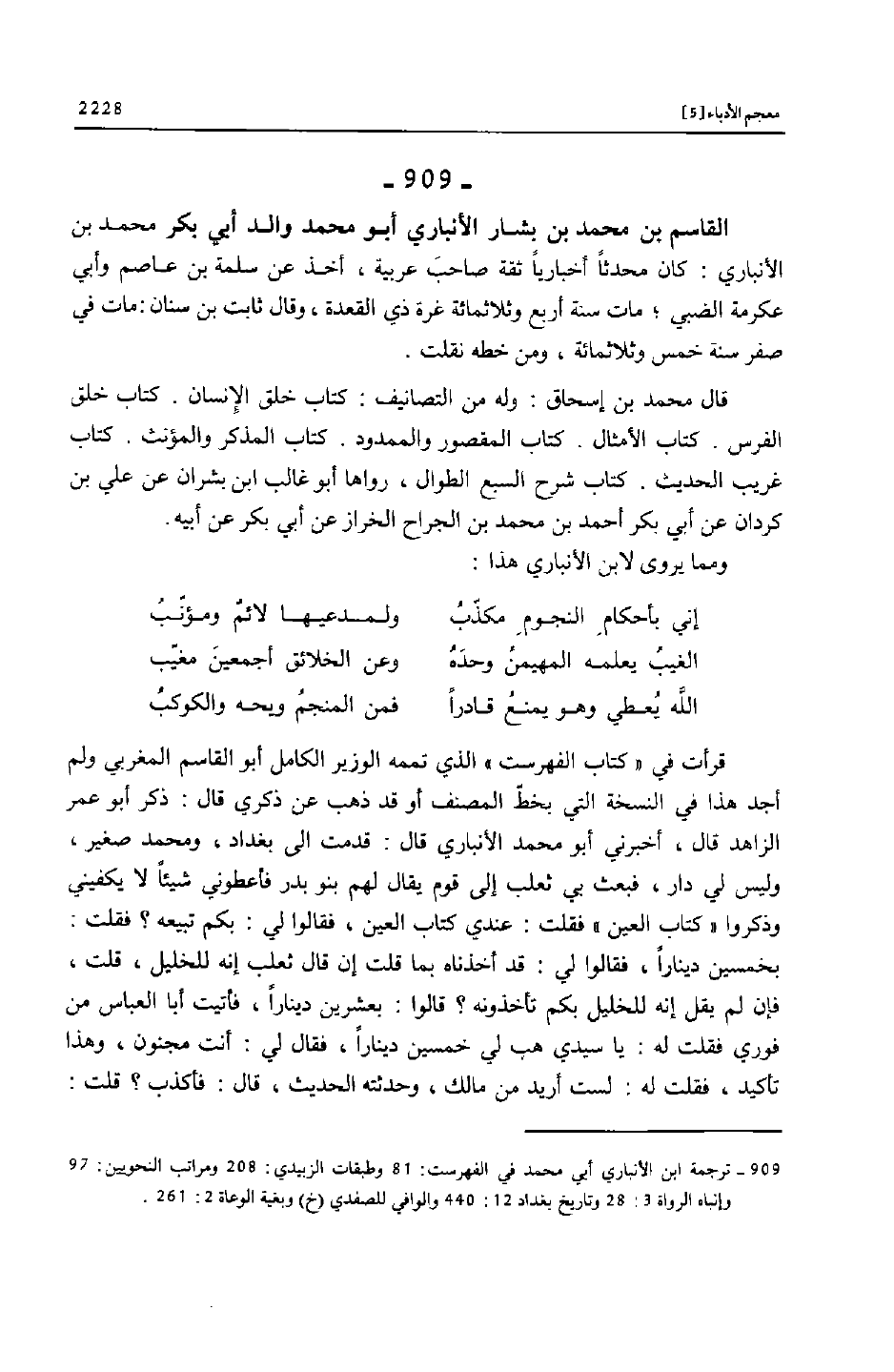 (909) - ترجمة ابن الأنباري أبي محمد في الفهرست: 81 وطبقات الزبيدي: 208 ومراتب النحويين: 97 وإنباه الرواة 3: 28 وتاريخ بغداد 12: 440 والوافي للصفدي (خ) وبغية الوعاة 2: 261.