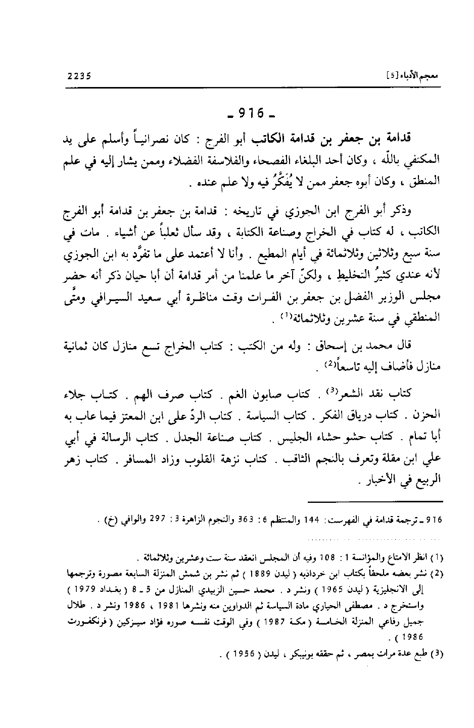 (916) - ترجمة قدامة في الفهرست: 144 والمنتظم 6: 363 والنجوم الزاهرة 3: 297 والوافي (خ) .