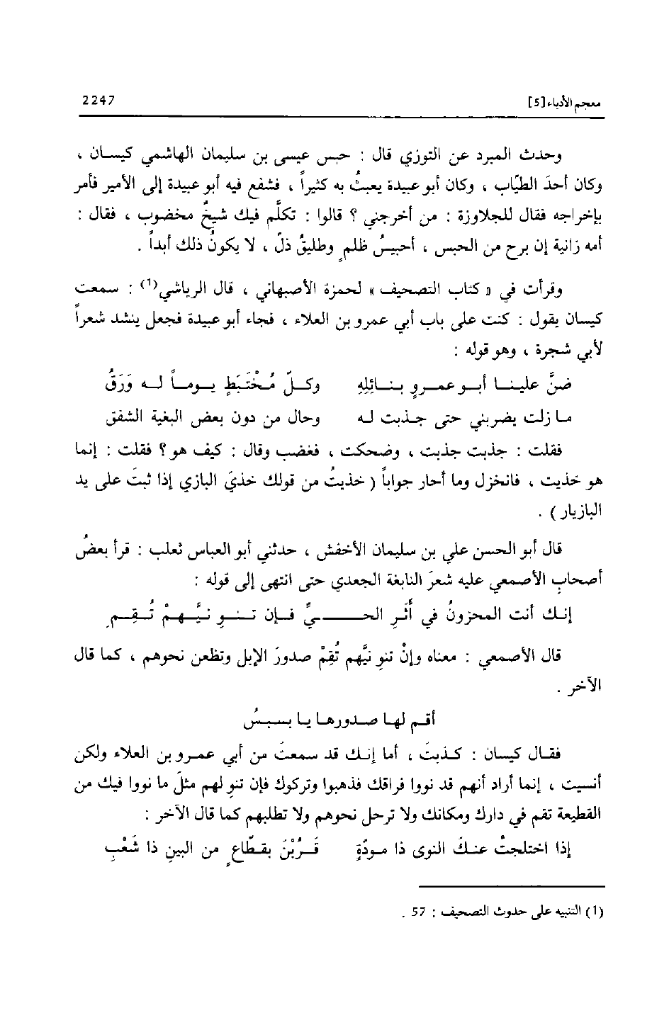 وقرأت في «كتاب التصحيف» لحمزة الأصبهاني، قال الرياشي «1» : سمعت كيسان يقول: كنت على باب أبي عمرو بن العلاء، فجاء أبو عبيدة فجعل ينشد شعرا لأبي شجرة، وهو قوله: