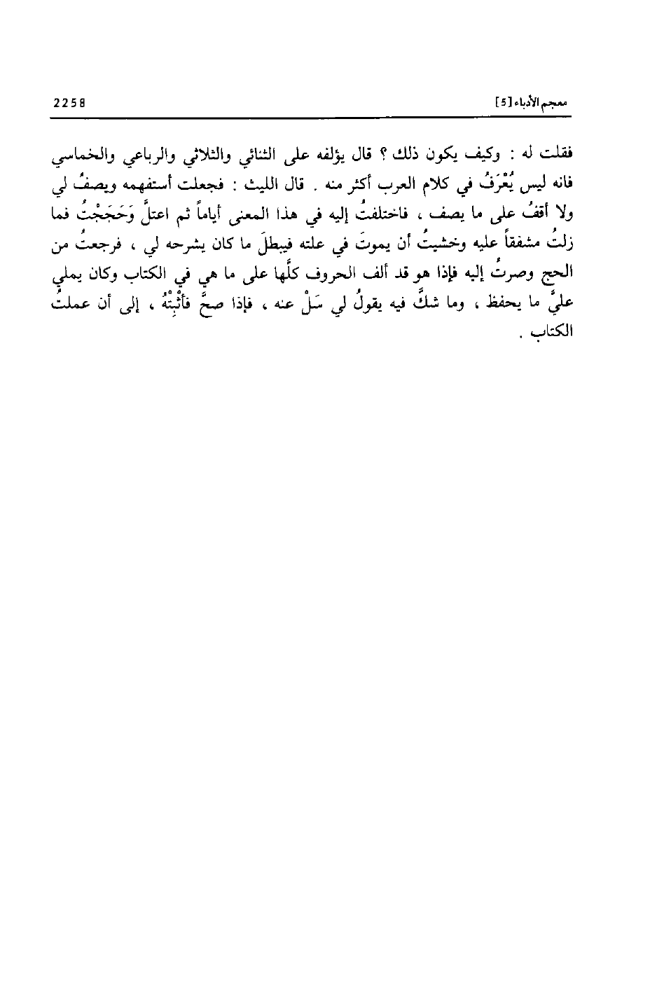 فقلت له: وكيف يكون ذلك؟ قال يؤلفه على الثنائي والثلاثي والرباعي والخماسي فانه ليس يعرف في كلام العرب أكثر منه. قال الليث: فجعلت أستفهمه ويصف لي ولا أقف على ما يصف، فاختلفت إليه في هذا المعنى أياما ثم اعتلّ وحججت فما زلت مشفقا عليه وخشيت أن يموت في علته فيبطل ما كان يشرحه لي، فرجعت من الحج وصرت إليه فإذا هو قد ألف الحروف كلّها على ما هي في الكتاب وكان يملي عليّ ما يحفظ، وما شكّ فيه يقول لي سل عنه، فإذا صحّ فأثبته، إلى أن عملت الكتاب.
