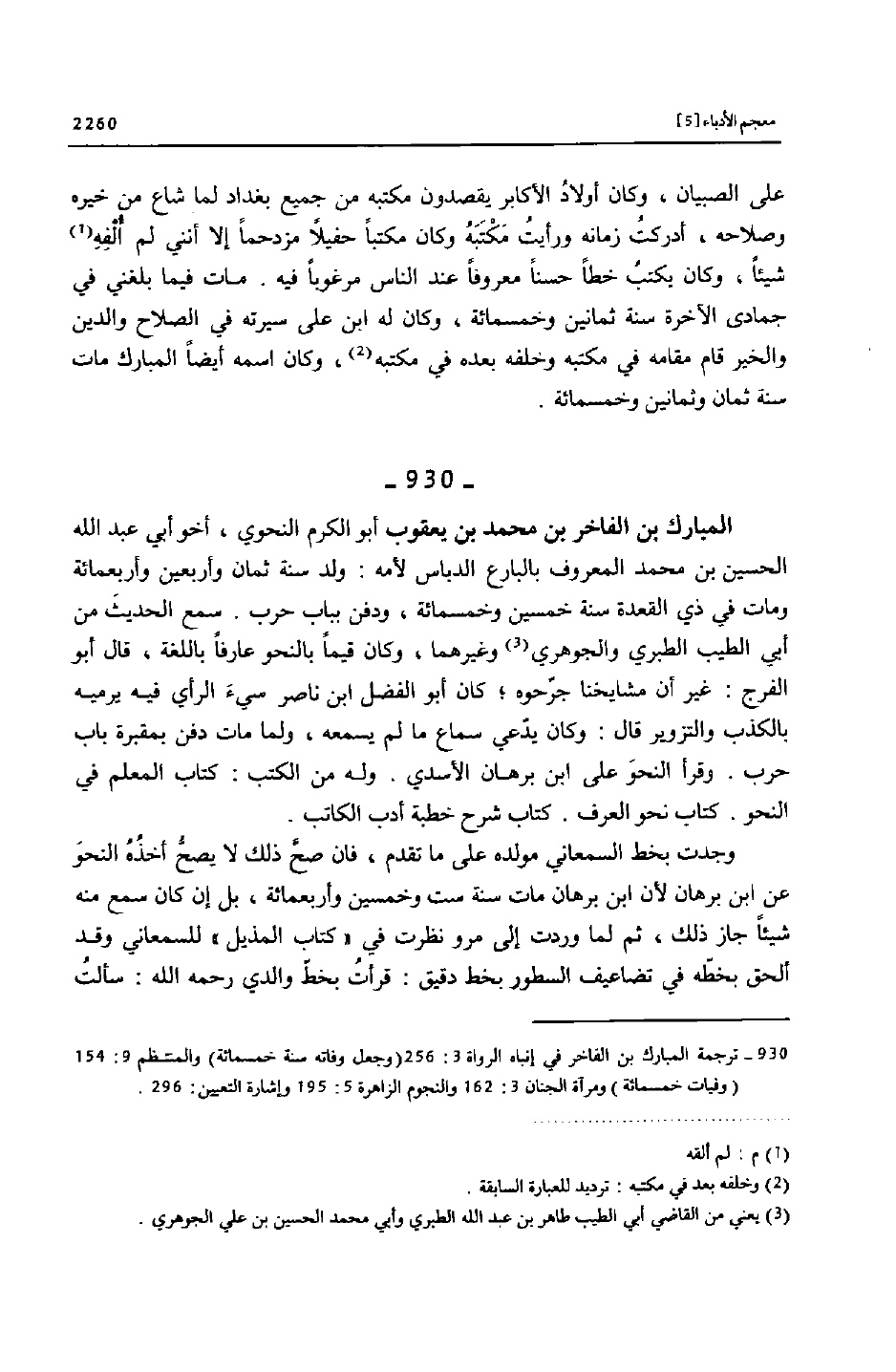 (930) - ترجمة المبارك بن الفاخر في إنباه الرواة 3: 256 (وجعل وفاته سنة خمسمائة) والمنتظم 9: 154 (وفيات خمسمائة) ومرآة الجنان 3: 162 والنجوم الزاهرة 5: 195 وإشارة التعيين: 296.