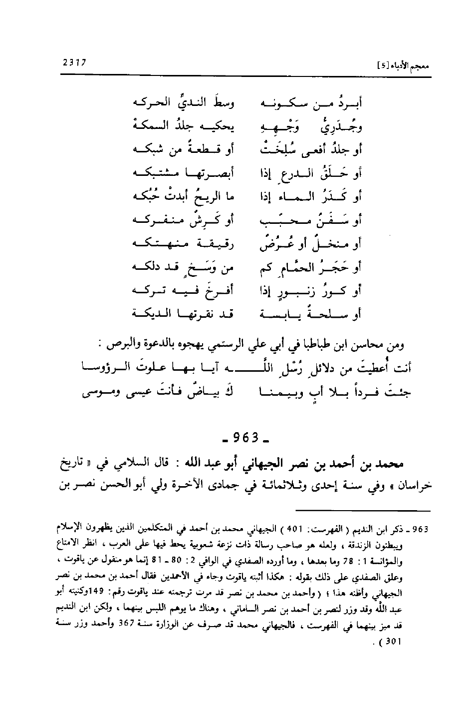 (963) - ذكر ابن النديم (الفهرست: 401) الجيهاني محمد بن أحمد في المتكلمين الذين يظهرون الإسلام ويبطنون الزندقة، ولعله هو صاحب رسالة ذات نزعة شعوبية يحط فيها على العرب، انظر الامتاع والمؤانسة 1: 78 وما بعدها، وما أورده الصفدي في الوافي 2: 80- 81 إنما هو منقول عن ياقوت، وعلق الصفدي على ذلك بقوله: هكذا أثبته ياقوت وجاء في الأحمدين فقال أحمد بن محمد بن نصر الجيهاني وأظنه هذا؛ (وأحمد بن محمد بن نصر قد مرت ترجمته عند ياقوت رقم: 149 وكنيته أبو عبد الله وقد وزر لنصر بن أحمد بن نصر الساماني، وهناك ما يوهم اللبس بينهما، ولكن ابن النديم قد ميز بينهما في الفهرست، فالجيهاني محمد قد صرف عن الوزارة سنة 367 وأحمد وزر سنة 301) .