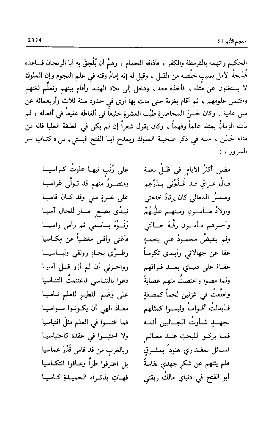 الحكيم واتهمه بالقرمطة والكفر، فأذاقه الحمام، وهمّ أن يلحق به أبا الريحان فساعده فسحة الأمل بسبب خلّصه من القتل، وقيل له إنه إمام وقته في علم النجوم وإن الملوك لا يستغنون عن مثله، فأخذه معه، ودخل إلى بلاد الهند وأقام بينهم وتعلّم لغتهم واقتبس علومهم، ثم أقام بغزنة حتى مات بها أرى في حدود سنة ثلاث وأربعمائة عن سن عالية. وكان حسن المحاضرة طيّب العشرة خليعا في ألفاظه عفيفا في أفعاله، لم يأت الزمان بمثله علما وفهما، وكان يقول شعرا إن لم يكن في الطبقة العليا فانه من مثله حسن، منه في ذكر صحبة الملوك ويمدح أبا الفتح البستي، من «كتاب سر السرور» :