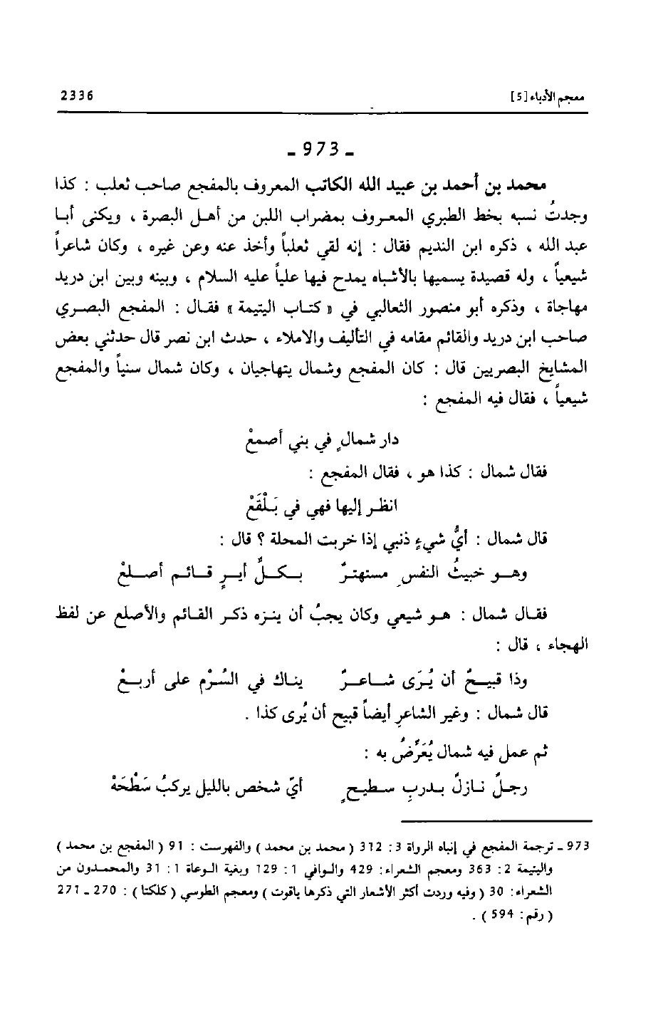 (973) - ترجمة المفجع في إنباه الرواة 3: 312 (محمد بن محمد) والفهرست: 91 (المفجع بن محمد) واليتيمة 2: 363 ومعجم الشعراء: 429 والوافي 1: 129 وبغية الوعاة 1: 31 والمحمدون من الشعراء: 30 (وفيه وردت أكثر الأشعار التي ذكرها ياقوت) ومعجم الطوسي (كلكتا) : 270- 271 (رقم: 594) .