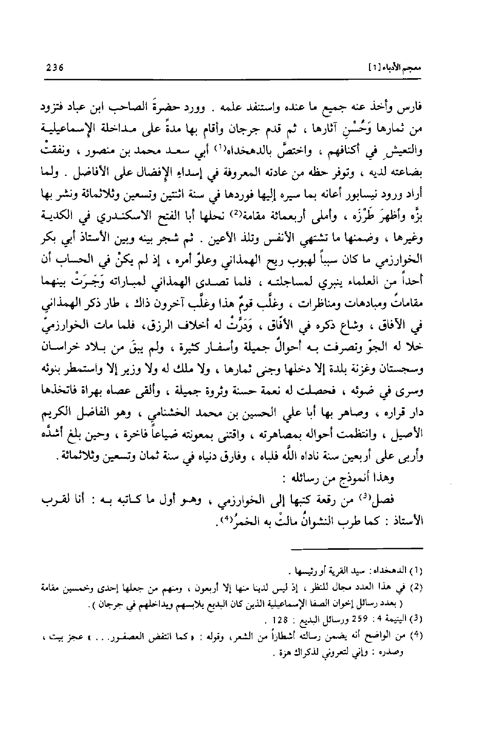 فارس وأخذ عنه جميع ما عنده واستنفد علمه. وورد حضرة الصاحب ابن عباد فتزود من ثمارها وحسن آثارها، ثم قدم جرجان وأقام بها مدة على مداخلة الإسماعيلية والتعيش في أكنافهم، واختصّ بالدهخداه [1] أبي سعد محمد بن منصور، ونفقت بضاعته لديه، وتوفر حظه من عادته المعروفة في إسداء الإفضال على الأفاضل. ولما أراد ورود نيسابور أعانه بما سيره إليها فوردها في سنة اثنتين وتسعين وثلاثمائة ونشر بها بزّه وأظهر طرزه، وأملى أربعمائة مقامة [2] نحلها أبا الفتح الاسكندري في الكدية وغيرها، وضمنها ما تشتهي الأنفس وتلذ الأعين. ثم شجر بينه وبين الأستاذ أبي بكر الخوارزمي ما كان سببا لهبوب ريح الهمذاني وعلوّ أمره، إذ لم يكن في الحساب أن أحدا من العلماء ينبري لمساجلته، فلما تصدى الهمذاني لمباراته وجرت بينهما مقامات ومبادهات ومناظرات، وغلّب قوم هذا وغلّب آخرون ذاك، طار ذكر الهمذاني في الآفاق، وشاع ذكره في الأفّاق، ودرّت له أخلاف الرزق، فلما مات الخوارزميّ خلا له الجوّ وتصرفت به أحوال جميلة وأسفار كثيرة، ولم يبق من بلاد خراسان وسجستان وغزنة بلدة إلا دخلها وجنى ثمارها، ولا ملك له ولا وزير إلا واستمطر بنوئه وسرى في ضوئه، فحصلت له نعمة حسنة وثروة جميلة، وألقى عصاه بهراة فاتخذها دار قراره، وصاهر بها أبا علي الحسين بن محمد الخشنامي، وهو الفاضل الكريم الأصيل، وانتظمت أحواله بمصاهرته، واقتنى بمعونته ضياعا فاخرة، وحين بلغ أشدّه وأربى على أربعين سنة ناداه الله فلباه، وفارق دنياه في سنة ثمان وتسعين وثلاثمائة.