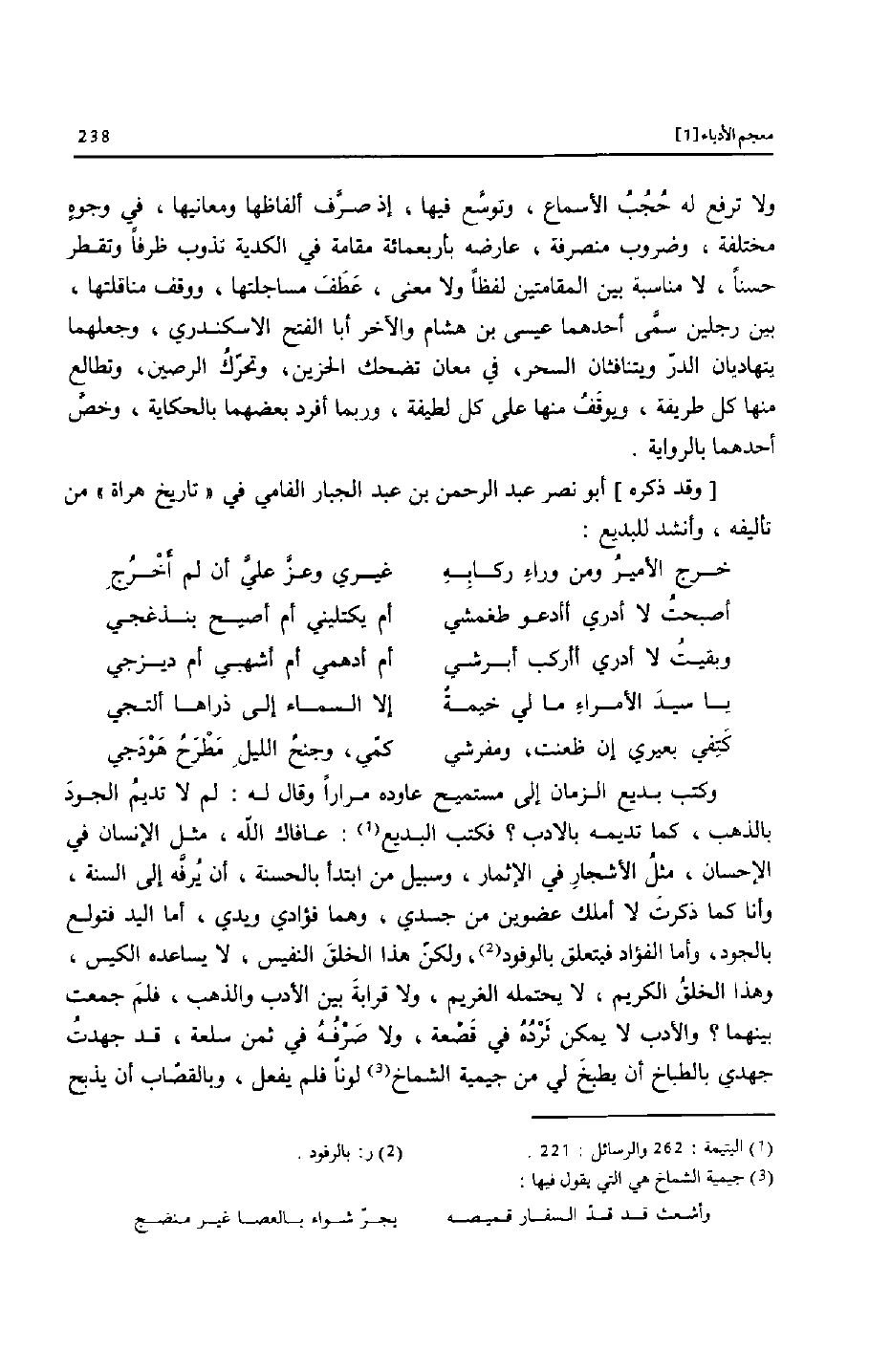 [وقد ذكره] أبو نصر عبد الرحمن بن عبد الجبار الفامي في «تاريخ هراة» من تأليفه، وأنشد للبديع: