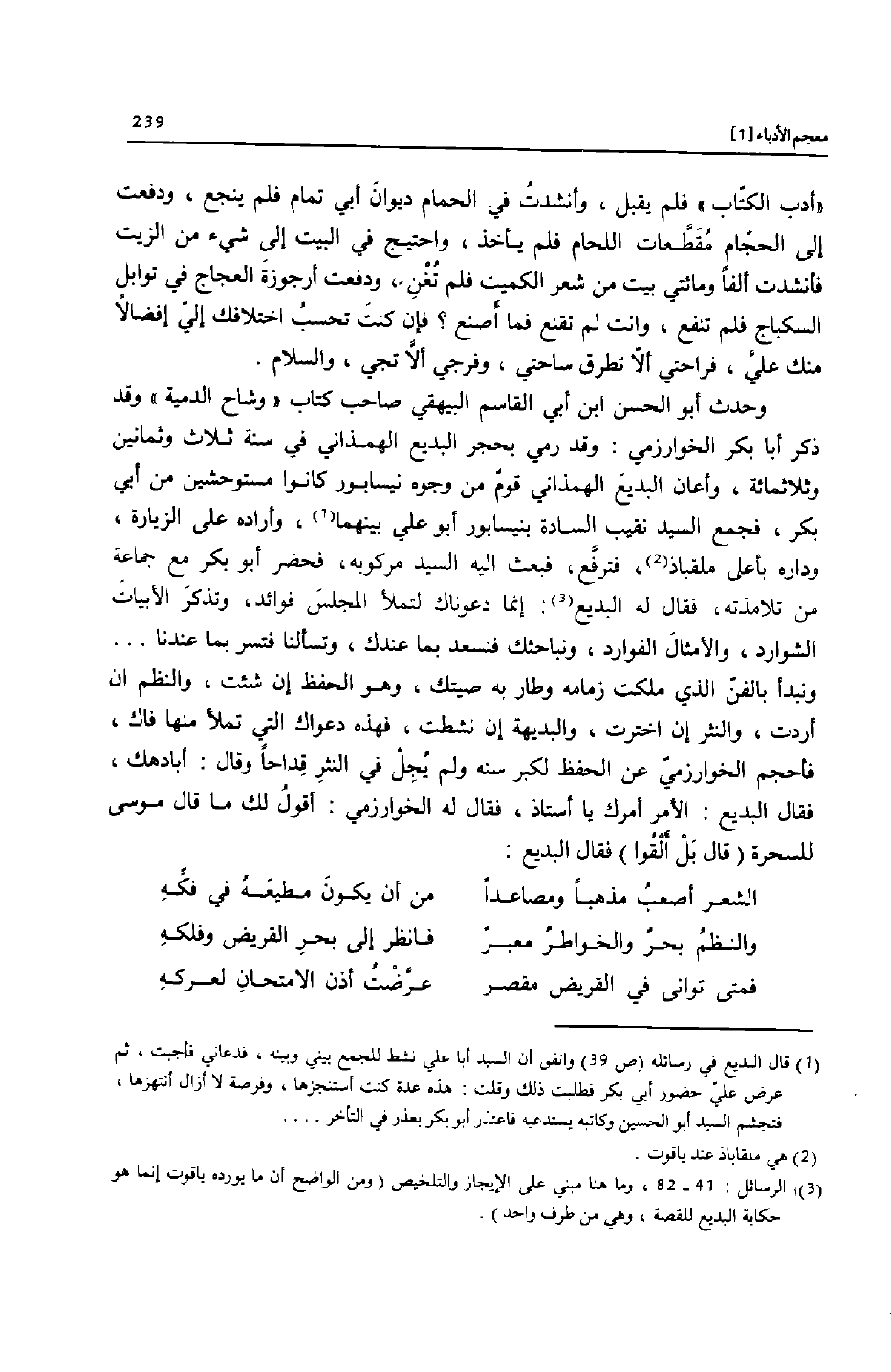 [3] الرسائل: 41- 82، وما هنا مبني على الإيجاز والتلخيص (ومن الواضح أن ما يورده ياقوت إنما هو حكاية البديع للقصة، وهي من طرف واحد) .