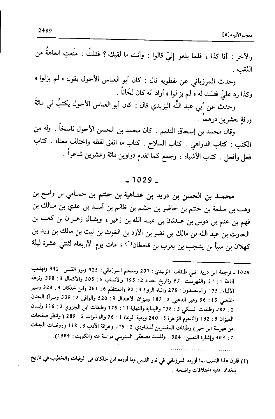 [1029] ترجمة ابن دريد في طبقات الزبيدي: 201 ومعجم المرزباني: 425 ونور القبس: 342 وتهذيب اللغة 1: 31 والفهرست: 67 وتاريخ بغداد 2: 195 والأنساب 5: 305 والاكمال 3: 388 ونزهة الألباء: 175 والمحمدون: 279 وانباه الرواة 3: 92 والمنتظم 6: 261 وابن خلكان 4: 323 وسير الذهبي 15: 96 وعبر الذهبي 2: 187 وميزان الاعتدال 3: 520 والوافي 2: 339 ومرآة الجنان 2: 282 وطبقات السبكي 3: 138 والبداية والنهاية 11: 176 وطبقات ابن الجزري 2: 116 ولسان الميزان 5: 132 والنجوم الزاهرة 3: 240 وبغية الوعاة 1: 76 والشذرات 2: 289 (وانظر صفحات من فهرسة ابن خير) وطبقات المفسرين للداودي 2: 119 وخزانة الأدب 3: 118 وروضات الجنات 7: 303 وإشارة التعيين: 304. وللسيد مصطفى السنوسي دراسة عنه (الكويت: 1984) .