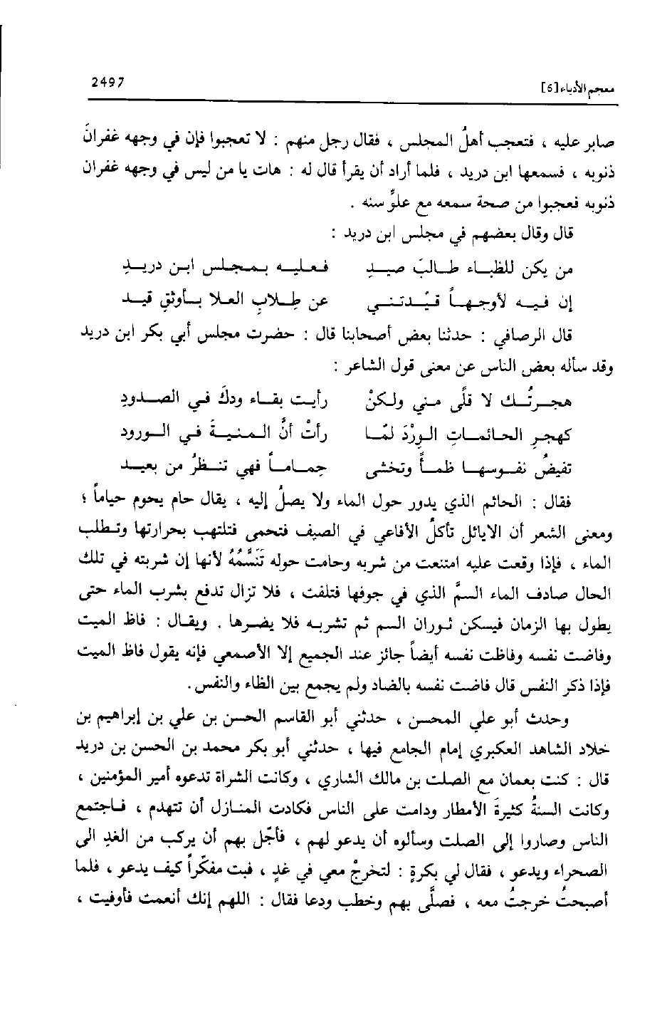 قال الرصافي: حدثنا بعض أصحابنا قال: حضرت مجلس أبي بكر ابن دريد وقد سأله بعض الناس عن معنى قول الشاعر: