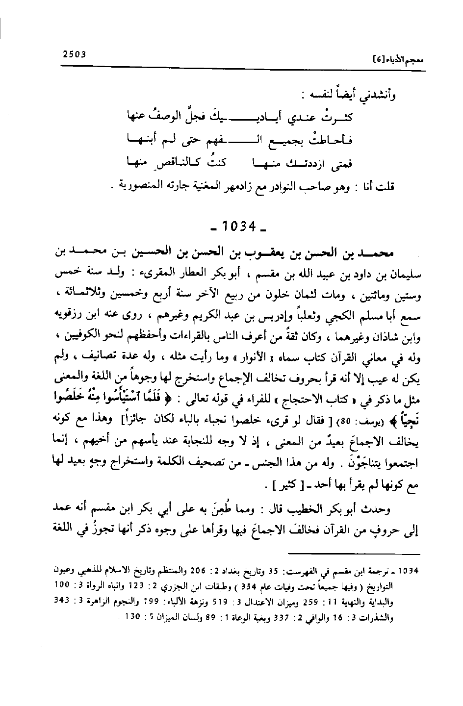 [1034] ترجمة ابن مقسم في الفهرست: 35 وتاريخ بغداد 2: 206 والمنتظم وتاريخ الاسلام للذهبي وعيون التواريخ (وفيها جميعا تحت وفيات عام 354) وطبقات ابن الجزري 2: 123 وانباه الرواة 3: 100 والبداية والنهاية 11: 259 وميزان الاعتدال 3: 519 ونزهة الألباء: 199 والنجوم الزاهرة 3: 343 والشذرات 3: 16 والوافي 2: 337 وبغية الوعاة 1: 89 ولسان الميزان 5: 130.