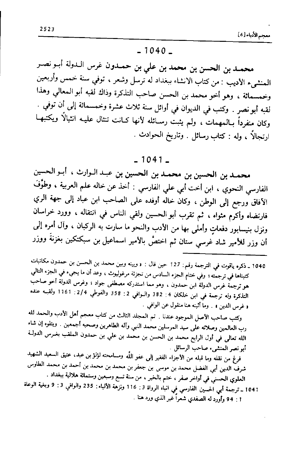 [1040] ذكره ياقوت في الترجمة رقم: 127 حين قال: «وبينه وبين محمد بن الحسن بن حمدون مكاتبات كتبناها في ترجمته؛ وفي ختام الجزء السادس من تجزئة مرغوليوث، وعد أن ما يجيء في الجزء التالي هو ترجمة غرس الدولة ابن حمدون، وهو مما استدركه مصطفى جواد؛ وغرس الدولة أخو صاحب التذكرة وله ترجمة في ابن خلكان 4: 382 والوافي 2: 358 والفوطي 4/2: 1161 ولقبه عنده «غرس الدين» . وما أثبته هنا منقول عن الوافي.
