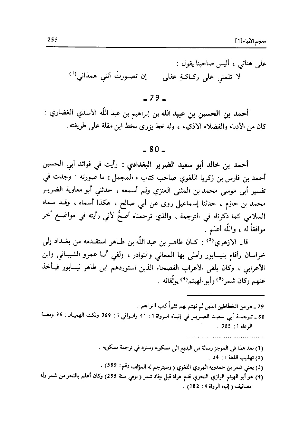 [4] هو أبو الهيثم الرازي النحوي قدم هراة قبل وفاة شمر (توفي سنة 255) وكان أعلم بالنحو من شمر وله تصانيف (إنباه الرواة 4: 182) .