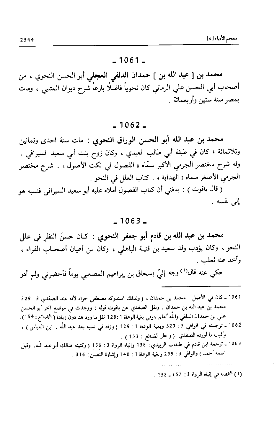 [1061] كان في الأصل: محمد بن حمدان، (ولذلك استدركه مصطفى جواد لأنه عند الصفدي 3: 329 محمد بن عبد الله بن حمدان. ونقل الصفدي عن ياقوت قوله: ووجدت في موضع آخر أبو الحسن علي بن حمدان الدلفي والله أعلم؛ وفي بغية الوعاة 1: 128 نقل ما ورد هنا دون زيادة (الضائع: 154) .