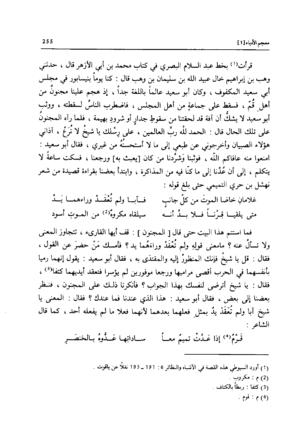 فما استتم هذا البيت حتى قال [المجنون] : قف أيها القارىء، تتجاوز المعنى ولا تسأل عنه؟ ما معنى قوله ولم تعقد وراءهما يد؟ فأمسك من حضر عن القول، فقال: قل يا شيخ فإنك المنظور إليه والمقتدى به، فقال أبو سعيد: يقول إنهما رميا بأنفسهما في الحرب أقصى مراميها ورجعا موفورين لم يؤسرا فتعقد أيديهما كتفا [3] ، فقال: يا شيخ أترضى لنفسك بهذا الجواب؟ فأنكرنا ذلك على المجنون، فنظر بعضنا إلى بعض، فقال أبو سعيد: هذا الذي عندنا فما عندك؟ فقال: المعنى يا شيخ آبا ولم تعقد يد بمثل فعلهما بعدهما لأنهما فعلا ما لم يفعله أحد، كما قال الشاعر: