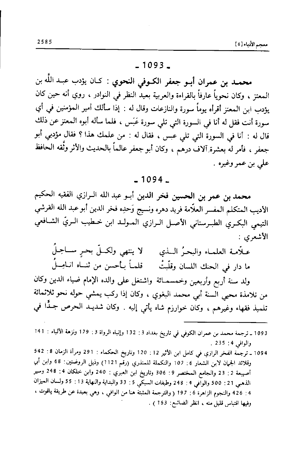 [1094] ترجمة الفخر الرازي في كامل ابن الأثير 12: 120 وتاريخ الحكماء: 291 ومرآة الزمان 8: 542 وقلائد الجمان لابن الشعار 6: 107 والتكملة للمنذري (رقم 1121) وذيل الروضتين: 68 وابن أبي أصيبعة 2: 23 والجامع المختصر 9: 306 وتاريخ ابن العبري: 240 وابن خلكان 4: 248 وسير الذهبي 21: 500 والوافي 4: 248 وطبقات السبكي 5: 33 والبداية والنهاية 13: 55 ولسان الميزان 4: 426 والنجوم الزاهرة 6: 197 (والترجمة المثبتة هنا من الوافي، وهي بعيدة عن طريقة ياقوت، وفيها اقتباس قليل منه، انظر الضائع: 163) .
