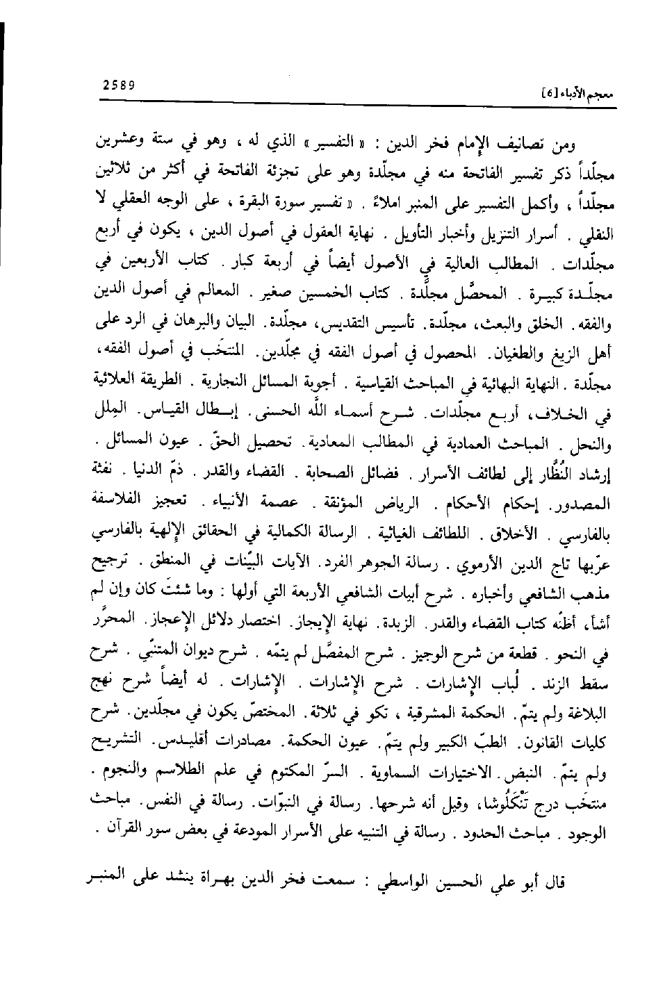 ومن تصانيف الإمام فخر الدين: «التفسير» الذي له، وهو في ستة وعشرين مجلّدا ذكر تفسير الفاتحة منه في مجلّدة وهو على تجزئة الفاتحة في أكثر من ثلاثين مجلّدا، وأكمل التفسير على المنبر املاء. «تفسير سورة البقرة، على الوجه العقلي لا النقلي. أسرار التنزيل وأخبار التأويل. نهاية العقول في أصول الدين، يكون في أربع مجلّدات. المطالب العالية في الأصول أيضا في أربعة كبار. كتاب الأربعين في مجلّدة كبيرة. المحصّل مجلّدة. كتاب الخمسين صغير. المعالم في أصول الدين والفقه. الخلق والبعث، مجلّدة. تأسيس التقديس، مجلّدة. البيان والبرهان في الرد على أهل الزيغ والطغيان. المحصول في أصول الفقه في مجلّدين. المنتخب في أصول الفقه، مجلّدة. النهاية البهائية في المباحث القياسية. أجوبة المسائل النجارية. الطريقة العلائية في الخلاف، أربع مجلّدات. شرح أسماء الله الحسنى. إبطال القياس. الملل والنحل. المباحث العمادية في المطالب المعادية. تحصيل الحقّ. عيون المسائل.