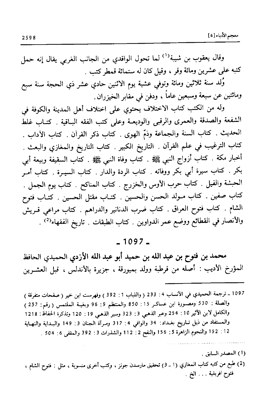 [1097] ترجمة الحميدي في الأنساب 4: 233 (واللباب 1: 392) وفهرست ابن خير (صفحات متفرقة) والصلة: 530 ومصورة ابن عساكر 15: 850 والمنتظم 9: 96 وبغية الملتمس (رقم: 257) والكامل لابن الأثير 10: 254 وعبر الذهبي 3: 323 وسير الذهبي 19: 120 وتذكرة الحفاظ: 1218 والمستفاد من ذيل تاريخ بغداد: 34 والوافي 4: 317 ومرآة الجنان 3: 149 والبداية والنهاية 12: 152 والنجوم الزاهرة 5: 156 والنفح 2: 112 والشذرات 3: 392 والمقفى 6: 504.