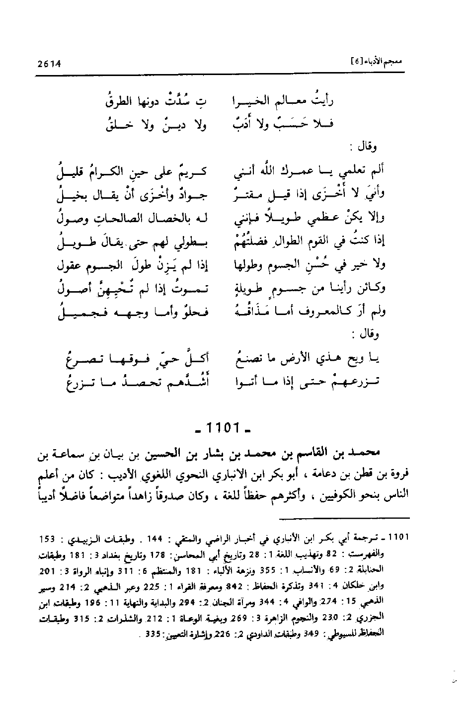 [1101] ترجمة أبي بكر ابن الأنباري في أخبار الراضي والمتقي: 144. وطبقات الزبيدي: 153 والفهرست: 82 وتهذيب اللغة 1: 28 وتاريخ أبي المحاسن: 178 وتاريخ بغداد 3: 181 وطبقات الحنابلة 2: 69 والأنساب 1: 355 ونزهة الألباء: 181 والمنتظم 6: 311 وإنباه الرواة 3: 201 وابن خلكان 4: 341 وتذكرة الحفاظ: 842 ومعرفة القراء 1: 225 وعبر الذهبي 2: 214 وسير الذهبي 15: 274 والوافي 4: 344 ومرآة الجنان 2: 294 والبداية والنهاية 11: 196 وطبقات ابن الجزري 2: 230 والنجوم الزاهرة 3: 269 وبغية الوعاة 1: 212 والشذرات 2: 315 وطبقات الحفاظ للسيوطي: 349 وطبقات الداودي 2: 226 وإشارة التعيين: 335.